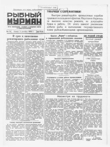 I ^ о б я з а т е л ь н ы й ms, Пролетарии всех стран, соединяйтёШ~~' РЫБНЫЙ ОРГАН ПОЛИТОТДЕЛОВ ТРАЛОВОГО И СЕЛЬДЯНОГО ФЛОТОВ И ГЛАВМУРМАНРЫБПРОМА іШ»Ии-М TWrfP Г ~ ~ " і I ТОВАРИЩИ СУДОРЕМОНТНИКИ! Быстрее ремонтируйте промысловые корабли тралового исельдяного флотов. Неустанно боритесь за высокое качество ремонта, не допускайте брака в работе. От этого зависит увеличение добычи рыбы и выполнение государственного плана рыбодобывающими организациями. В срок и качественно ремонтировать рыболовные суда ■Предприятия рыбной промышлен-' простаивают целыми сутками из-за Колхоз „Моряк" — победитель в соревновании рыболовецких колхозов по РОДНОЙ СТРАНЕ ногСти Мурманского бассейна продол жают работать неудовлетворительно. Одна из причин невыполнения го сударственного плана по добыче ры бы заключается в задержке большого количества кораблей в ремонте сверх времени, установленного графиком. Так, нащшіер, на Мурманской судо верфи в ноябре простояла в ремонте целая группа траулеров, которые согласно графику должны были выйти на промысел еще в октябре. Завод междурейсового ремонта, хо тя и справляется с государственным планом, но может и должен работать значительно лучше для того, чтобы моряки могли сократить междурейсои вые стоянки. Из публикуемых сегодня в нашей газете материалов по Мрам-мысским мастеірским видно, что здесь также имеется ряд серьезных недостатков в раіботе. Для судоремонтников наступил са мый ответственный период — зим ний ремонт рыболовном флота. Сей час у причалов судоремонтных пред приятий ждут ремонта десятки ры боловных судов. . Отсюда видно, какая огромная от ветственность ложится на коллекти вы судоремонтных предприятий. В связи с этим необходимо, чтобы хо зяйственные руководители, партий ные, комсомольские и профсоюзные организации развернули широкую разъяснительную работу среди своих коллективов с тем, чтобы каждый ра бочий, каждый инженерно-техниче ский раіботник глубоко проникся соз нанием этой большой ответственно сти за своевременный и качествен ный ремонт рыболовного флога. В срок и качественно ремонтиро вать суда — боевая задача судоре монтников. Но нельзя снимать ответ ственности и с руководителей рыбо добывающих организаций за своевре менный и высококачественный ре монт кораблей. Нельзя мириться с таким положением, когда, например, корабли «Мурманеельди» становятся на ремонт без дефектных ведомостей, или когда эти ведомости составлены небрежно, а командный состав этих кораблей, отвечающий ва ремонт судов, является на работу в 11— 12 часов дня, как это имеет место на Абрам-мысских мастерских. Ясно, что такое отношение заказчиков не может быть терпимым. Заказчики обязаны всячески содействовать ус корению ремонта судов, строго конт ролировать качество работы, а какое же это содействие заказчика, когда корабли, поставленные на ремонт, несвоевременного представления де фектных ведомоетей. Технический отдел «Мурманеельди» и его руко водитель тов. Бородулин должны немедленно устранить эти недо статки. Необходимо также, чтоібы техниче ский отдел Главмурманрыбщрома взял под контроль работу судоремонтных предприятий и оказал им необходи мую помощь. Этот отдел медленно решает ряд важных вопросов, кото рые поднимают судоремонтники, в частности Абрам-мысские мастер ские. Нельзя медлить с решением 