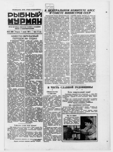 ПРОЛЕТАРИИ ВСЕХ СТРАН, СОЕДИНЯЙТЕСЬ! РЫБНЫЙ [Г*о с у д а а т г ч е н н а я орде.'.л /іежма и И и у К С ' L H А. 1 ОРГАН ПАРТИЙНЫХ КОМИТЕТОВ ТРАЛОВОГО И СЕЛЬДЯНОГО ФЛОТОВ И ГЛАВМУРМАНРЫБПРОМА НАВЕСТИ ОБРАЗЦОВЫЙ ПОРЯДОК НА СУДАХ1 Р ЫБОДОБЫВАЮЩИЕ * предприятия Глав- мурманрыбпрома задолжали го­ сударству в этом году более по­ лумиллиона центнеров рыбы. Задолженность продолжает ра­ сти. Особенно неудовлетвори­ тельно работал в первом кварта­ ле коллектив тралового флота; не справились с квартальным планом и моряки «Мурмансель- дн», рыбаки-колхозники. Казалось бы, что сейчас на всех предприятиях и кораблях рыбной промышленности обла­ сти должна чувствоваться пов­ седневная тревога за создавшее­ ся положение, особенная чет­ кость и слаженность во всех звеньях, ритмичность, боевая подтянутость. Каждый работник, будь то руководитель или рядовой про­ изводственник, обязан проник­ нуться чувством глубочайшей ответственности за порученное ему дело. В первых рядах борь­ бы за ликвидацию отставания должны находиться коммунисты и комсомольцы, личным приме­ ром показывая, как надо бороть­ ся за выполнение решений XX съезда КПСС, декабрьского и февральского Пленумов Цент­ рального комитета партии. Одной из причин отставания является^ крайне низкая трудо­ вая и производственная дисцип­ лина. Десятки и сотни часов дорогого промыслового времени теряются нз-за безответственно­ сти отдельных нерадивых работ­ ников. Участились случаи нару­ шения Устава службы на судах Флота рыбной промышленности СССР. Число аварий, допущенных по вине нарушителей трудовой дисциплины, сейчас значитель­ но выше, чем было в этот же период прошлого года. Проис­ ходят они подчас по вине тех, кто должен вести непримири­ мую борьбу с малейшими нару­ шениями дисциплины. Так, 15 марта на плавбазе «Памяти Ки­ рова» произошел пожар, кото­ рый вызвал простой корабля в порту и причинил большой убы­ ток. Пожар начался в каюте бывшего первого помощника ка­ питана корабля Смирнова, кото­ рый вместо -того, чтобы выпол­ нять возложенные на него вы­ сокие функции воспитателя и организатора команды, пьянст­ вовал с подчиненными ему чле­ нами экипажа. Характерно, что за несколько часов до пожара на корабль прибыл начальник «Мурмансельдн» Гунин со сво­ им заместителем Ефимовым, вместо того, чтобы немедленно принять меры к наведению по­ рядка на корабле, Гунин и Ефи­ мов, уединившись в каюте ка­ питала плавбазы Корсак, заня­ лись там распитием спиртных напитков. Гунин снят с работы, непо­ средственные виновники пожа­ ра привлекаются к уголовной ответственности. Но значит ли это, что дело о пожаре на плав­ базе «Памяти Кирова» можно считать законченным? Нн в во­ ем случае. Партийные, комсо­ мольские и профсоюзные орга­ низации судов тралового и сель­ дяного флотов должны сделать из случившегося самые серьез­ ные выводы. На днях работники Главмур- манрыбпрома при участии пред­ ставителей Мурманского горко­ ма и Микояновского райкома КПСС проводили проверку не­ сения вахтенной службы и со­ стояния дисциплины на стоя­ щих в порту судах Мурманского и Архангельского траловых флотов, «Мурмансельдн», прн- емо-транспортного флота. Ре­ зультаты проверки показали, что на многих судах вахтенная служба поставлена из рук вон плохо, на ряде кораблей отсутст­ вуют у трапа и на палубе вах­ тенные ма