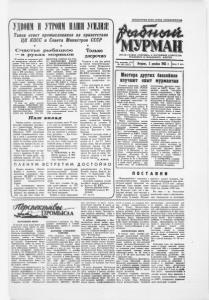 и ПРОЛЕТАРИИ ВСЕХ СТРАН, СОЕДИНЯЙТЕСЬ! Таков ответ промысловиков иа приветствие ЦК КПСС и Совета Министров СССР С ч а с т ь е р ы б а ц к о е — в р у к а х м о р я к о в 30 ноября из очередного рей­ са возвратился траулер «Мол­ давия». Рейс был хотя и три­ надцатым по счету, но, как и все предыдущие, оказался сча­ стливым. 1000 центнеров све­ жья и 600 центнеров соленой рыбы доставил в порт экипаж, почти в два раза перевыполнив рейсовое задание. А счастье рыбацкое — оно в руках самих моряков. Сверх­ плановый вылов обеспечили своим самоотверженным тру­ дом судоводители, руководи­ мые капитаном тов. Карасевым, машинная команда во главе с тов. Поликарповым, старший мастер по добыче рыбы тов. Петров, матросы тт. Иванов, Локтюхов... В этом же рейсе экипаж «Молдавии» ЗАВЕРШИЛ ВЫ­ ПОЛНЕНИЕ ПОВЫШЕННО­ ГО СОЦИАЛИСТИЧЕСКОГО ОБЯЗАТЕЛЬСТВА, ПРИНЯ­ ТОГО НА ПЯТЫЙ ГОД СЕ­ МИЛЕТКИ. СЕЙЧАС НА СЧЕ­ ТУ КОЛЛЕКТИВА БОЛЕЕ 17 ТЫСЯЧ ЦЕНТНЕРОВ РЫБ­ НОГО ПОЛУФАБРИКАТА, за­ готовленного за одиннадцать месяцев при годовом плане 15300 центнеров. Почти три четверти рыбного полуфабри­ ката составляет свежье. Уже на переходе в порт мо­ ряки услышали по радио при­ ветствие ЦК КПСС и Совета Министров СССР работникам рыбной промышленности стра­ ны в связи с досрочным завер­ шением программы пятого года семилетки по добыче рыбы. Это приветствие глубоко взволновало экипаж. Ведь в общем успехе рыбаков страны есть и их вклад. А в ответ на пожелание новых побед моряки «Молдавии» дали слово тру­ диться, не снижая темпов, н рассчитывают довести к концу года сверхплановый вылов до 2700 центнеров. Н а ш в к я а д Экипаж нашего траулера с большим вниманием знакомил­ ся с приветствием Централь­ ного Комитета КПСС и Совета Министров СССР работникам рыбной промышленности стра­ ны в связи с досрочным завер­ шением годового плана добычи рыбы. До глубины души взвол­ новало оно каждого из нас, за­ ставило подумать о делах на­ шего траулера. Наш траулер только что вер­ нулся с промысла. В порт до­ ставлено 92 тонны рыбы при рейсовом задании 48 тонн. До выполнения годового плана ос­ талось выловить около 20 тонн и 45 тонн до завершения со­ циалистических обязательств. Выполнение плана и обязатель­ ства мы закончим к всенарод­ ному празднику — Дню Совет­ ской Конституции. Экипаж «Грязовца» сделает все для того, чтобы внести до­ стойный вклад в борьбу кол­ лектива тралового флота за лик­ видацию задолженности по до­ быче рыбы. П. РОМАНЧИК, В. МА- МАПВ, матросы, В. МИ- ХАЛ ЬКОВ, кочегар трау­ лера «Грязовец». Только досрочно Спорится в эти дни работа на первом погрузочно-разгру­ зочном участке Мурманского рыбного порта. Соревнуясь в честь предстоящего Пленума ЦК КПСС, портовики берут по­ вышенные социалистические обязательства — досрочно об­ рабатывать промысловые ко­ рабли. Слово портовиков не расхо­ дится с делом. На днях вер­ нулся с промысла траулер «Астрахань». За разгрузку взялась бригада, руководимая депутатом городского Совета Антонидой Цырюльниковой. Быстро открыты трюмы, убра­ ны чердачные доски. Дружно закипела работа. Лебедчица Тамара Квашнева только успе­ вает выполнять команды сиг- налыцицы Раисы Хоняковой. Стампа за стампой, доверху на­ полненные треской, через ко­ роткие промежутки времени поднимаются на стеллинг. В трюме без суеты, но проворно работают 0. Анискова, Д. Ку­ зяева, В. Кравчен