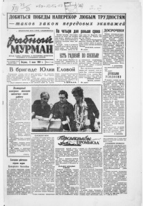1ДОБИТЬСЯ ПОБЕДЫ НАПЕРЕКОР ЛЮБЫМ ТРУДНОСТЯМ! S 9 таков з а к о н передовых экипажей ПРОЛЕТАРИИ ВСЕХ СТРАН, СОЕДИНЯЙТЕСЬ! ОРГАН ГЛАВКА «СЕВРЫБА» И ПАРТИЙНЫХ КОМИТЕТОВ ТРАЛОВОГО И СЕЛЬДЯНОГО ФЛОТОВ Гол издания 11-й № 80 (1261) Вторник, 1963 2 июля г. Цена 2 коп. На четыре дня раньше срока Экипаж траулера «Засольщик» досрочно «а четыре дня завершил план второго квартала по добыче рыбы, а также полугодовой план по выработке консервов, жира, рыб ной муки. Большой вклад в достижение трудовой победы внесли: мастер по добыче рыбы тов. Алямовский, матрос Рыженков, мастер по вы- греву жира тов. Владыкин, стар шин машинист тов. Тарасов, боц ман тов. Жарков. Моряки одобряют Постановление июньского Пленума ЦК КПСС. На судне началась работа по разъяс нению членам экипажа материалов Пленума. ПРОСТНЕВ, помполит. (По радио). 27 июня моряки «Курейкн» вы полнили свое обязательство: за вершили годовой план по заготов- В бригаде Юлии Еловой Нагруженные стампы одна за другой высоко взмывают над па лубой судна, проплывают над при чалом и, освободившись от рыбы, снова скрываются в черном окне трюма. — Вира!—слышится команда, и Всемирный конгресс женщин закончил свою кран повторяет ту же операцию. А внутри трюма кипит горячая работа. Споро идет работа в бригаде, руководимой молодым бригадиром Юлией Еловой. Бригада тов. Ело вой считается одной из лучших первого погрузочно-разгрузочного участка рыбного порта. Она си стема тически перевылолняет смен • ные задания, досрочно обрабаты вает промысловые корабли и ж е лезнодорожные вагоны. Ф. ШАПОВАЛОВ, ПОСВЕИ ке охлажденного полуфабриката. На счету экипажа более 8.200 центнеров свежья. Удельный вес его к общей добыче составляет девяносто процентов. Наш комеомольско-молодежныл экипаж свой трудовой успех по святил Дню советской молодежи. Настроение у всех хорошее. При лагаем вое силы к тому, чтобы до срочно выполнить годовой план. ЛОЖКИН, капитан, ЗВЕРЕВ, помполит. (По радио). работу МОСКВА, 29 июня. (ТАСС). Сегодня закончил работу Все мирный конгресс женщин, про должавшийся шесть дней в Кремлевском Дзорце съездов. Вечером на заключительном пленарном заседании были за слушаны доклады об итогах ра^ боты в комиссиях. «Права жен щин в обществе и семье*. «Мир, разоружение и дружба между народами», «Борьба жен щин за национальную незави симость», «Здоровье, воспита ние и образование детей и мо лодежи». Затем участникам конгресса было сообщено о результатах выборов руководящих органов Международной демократиче ской федерации женщин. Пре зидентом федерации вновь избрана Эжени Коттон. Почет ными вице-президентами стали Леонора Андре Аддрэен (Швеция) и Долорес Ибаррури (Испания). На. конгрессе была оглашена программа деятельности феде рации. Участники конгресса приня ли обращение к женщинам, ма терям всех стран, всех конти нентов: На снимке: в президиуме конгресса (слева направо) Эже- ки Коттон, Н. Попова и В. Те решкова. (ТАСС). Совещание работников отделов кадров Северного бассейна В главном управлении «Севрм- ба» состоялось совещание работни ков отделов кадров предприятий Северного бассейна. Совещание от крыл начальник главка А. И. Фи липпов. С докладом «О состоянии и мерах по улучшению работы с кадрами на флотах н рыбообраба тывающих предприятиях Северного бассейна» выступил начальник от дела кадров главного управления «Севрыба» В. В. А