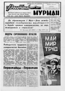 ПРОЛЕТАРИИ ВСЕХ СТРАН, СОЕДИНЯЙТЕСЬ! !- -ада.<.ѵа В Т О Р Н И К , 1 М А Я 1 9 7 9 г. № 49 (3713) Газета издается с 14 а п р е л я 1934 г. Орган Всесоюзного рыбопромышленного объединения «Севрыэа», парткома Мурманского ордена Октябрьской Революции тралового флота и парткома объединения «Мурманрыбпром» МУРМАІІ I Д а з д р а в с т в у е т / М а я — День м е ж д у - I народной с о л и д а р н о с т и т р у д я щ и х с я I в борьбе п р о т и в и м п е р и а л и зм а , за м и р , I д е м о к р а т и ю и с о ц и а л и зм ! ] И з П р и з ы в о в Ц К К П С С к 1 М а я 1 9 7 9 года. Хорошо подняться утром рано, Видеть голубую высоту, Видеть стройки, площади и краны, И суда на отдыхе в порту. Видеть город мирный и счастливый, Но широким улицам шагать. Свежий ветер с Кольского залива Полной грудью весело вдыхать. Высоко знамена поднимая, Рыбаки по улицам ідут. С праздником, Отчизна! С Первомаем! Пусть всегда сияют мир и труд! К. ИЛЬИН . ЛИДЕРЫ СОРЕВНОВАНИЯ ОТРАСЛИ Министерство рыбного хо зяйства СССР и ЦК профсоюза рабочих пищевой промышлен. йостн подвели итоги социали стического соревнования тру жеников отрасли за первый Квартал четвертого года пяти летки. Переходящие Красные зна мена Министерства и ЦК проф союза и первые денежные пре мил присуждены коллективам <Севрыбхо лодфлота », Мур манского рыбокомбината и Мурманского рыбного порта, объединения «Мурманская су доверфь» . Экипажам БМРТ «Салют», «Мурмансельдь», «Певек», РТ «Гурзуф», СГР «Сосногорск» и плавбазы «Профессор Баранов» присуждены переходящие вым пелы и первые денежные пре мии Министерства рыбного хо зяйства СССР и ЦК профсою за рабочих пищевой промыш ленности. П о б е д и т е л и т р у д о в о г о с о п е р н и ч е с т в а б а с с е й н а По итогам социалистическо го соревнования тружеников Северного рыбопромышленного бассейна за первый квартал І979 года переходящее Крас ное знамя и первая денежная Премия Всесоюзного объедине ния «Севрыба» и ЦК профсо юза рабочих пищевой промыш ленности присуждены коллек тиву объединения «Мурман рыбпром». Вторые денежные премии присуждены коллективам Ар хангельского рыбокомбината, тарного комбината и фабрики орудий лова. Третьи денежные премии — у коллективов Беломорской ба зы гослова, Соломбальской судо верфи, Сортавальского рыбоза вода и Мурманской транспорт но-складской конторы. Отмечена хорошая работа коллективов Беломорского ры бокомбината, Кестеньгского рыбозавода, Архангельского су доремонтно - судостроительного завода, управления транс- портно . рефрижераторного флота и Архангельской конто ры по сбыту рыбопродукции. Переходящие вымпелы и пер вые денежные премии Всесо юзного объединения «Севрыба» и ЦК профсоюза рабочих пи щевой промышленности прису ждены экипажам БАТ «Капи тан Маклаков», БМРТ «Плуто ний», «Карпогоры» и плавбазы «Арктика». Вторые денежные премии — у экипажей БМРТ «Прионе- жье», «Лесков4», «Пушкин» Мурманского тралового флота, СРТ «А. Никитин» и СРТ-р «Аист» объединения «Мурман рыбпром», БМРТ «Северянин» и ПСТ «Жиздра» объединения «Архангельскрыбпром», СРТ «Алексеевский» объединения «Карелрыбпром», БМРТ «Н. Кононов» управления «Сев- рыбпромразведка», РМБ «Ри га» управления «Севрыбхолод- флот». Третьи денежные премии при суждены экипажам ППР «На вигатор», БМРТ «Ярославль», «Планета», ГІСТ «Калининск», РТ «Смоленск», «Медногорск» Мурманского тралового флота, PC «Кианит» объедине