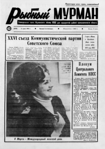 Пролетарии всех стран, соединяйтесь! М У Р М А І І Еженедельная газета Мурманского обкома КПСС для предприятий рыбной промышленности области (3878] 6 марта 1981 г, • Выходит по пятницам • И з д а е т с я с 1934 г. • Ц е н а 5 к о п , XXVI съезд Коммунистической партии Советского Союза Москва. (ТАСС). 2*3 ф. • ь я л я На съезде з а к о н ч и л о с ь обсуждение Отчетного докла да Центрального Комитета КПСС и отчета .Центральной Ревизионной К о м и с с и и КПСС, Завершившие прения деле, гаты — первый секретарь Алтайского крайкома парт::,; Н. Ф. Аксенов, первый сек. композиторов СССР Т. Н. Хренников, первый секре тарь Тюменского обкома пар тии Г. 11. Богомяков, первкіі секретарь Донецкого обкома КП Украины'Б. В. Качура. первый секретарь Краснояр ского крайкома партии П. С. Федирко, первый секретарь Татарского обкома партии Р. М. Мусин и другие, как :: все ораторы, выступившие ранее, предложили одобрить представленные на рассмот рение съезда документы. Съезд единогласно принял резолюцию по докладу това рища Л. II. Брежнева — От чет Центрального Комитета КПСС XXVI съезду Комму, нпстнческой партии Совет ского Сою >-• и очередные задачи партий в области внутренней и внешней, поли тики. Съезд целиком и пол ностью одобрил ленинский курс и практическую дея тельность Центрального Ко митета партии, одобрил От четный доклад ЦК КПСС и предложил всем партийным организациям руководство- 3мартазМоет, з Кремлевском Дзорщ съездов, ваться в своей раооте поло, жениями. и задачами в об ласти внутренней и внешней политики, выдвинутыми в докладе товарищем Л. И. Брежневым. (Окончание на 2-й стр.* 8 Марта — Международный женский день Пленум Центрального Комитета КПС 3 марта 1981 г. состоялся Пленум Центрального Комитета КПСС, из бранного XXVI съездом Коммуни стической партии Советского Союза. Пленум единодушно избрал това рища Брежнева J1. И. Генеральным секретарем ЦК КПСС. Пленум единодушно избрал По литбюро ЦК КПСС в следующем составе: члены Политбюро товарищи Брежнев J1. И., Андропов Ю. В., Горбачев М. С., Гришин В. В.. Гро мыко А. А., Кириленко А. П., Ку наев Д . А., Пельше А. Я-. Рома нов Г. В., Суслов М. А., Тихо нов Н. А., Устинов Д . Ф.. Чернен ко К. У., Щербицкий В. В. Кандидаты в члены Политбюро товарищи Алиев Г. А.. Деми - чев П. Н„ Киселев Т. Я.. Кузне цов В. В., Пономарев Б. Н., Раши дов Ш. Р., Соломенцев М. С., Ше варднадзе Э. А. Секретарями ЦК КПСС избраны товарищи Брежнев J1. И. — Гене ральный секретарь ЦК, Сус лов М. А., Кириленко А. П., Чер ненко К. У., Горбачев М. С., Поно марев Б. Н..: Капитонов И. В., Д о л гих 13. И., Знмянин М. В.. Р у с а ков К. В. Пленум утвердил председателем Комитета партийного контроля при ЦК КПСС той. Пельше А. Я. (ТАСС ) Ж Е Н Щ И Н А , к о т о р у ю вы в и д и те н а э то м с н и м к е , ж и в е т и р а б о та е т в М у р м зн - с н е , и , н а в е р н о е , в ы н е о д н а ж д ы е е в с т р е ч а л и — н а у л и ц е , в а в т о б у с е , н а о с т а н о в к а т а к с и ... А с е го д н я п р о ч и т а й т е о ней о ч е р к (он о п у б л и к о в а н н а 8-й с т р .) и п о м н и т е п р и э т о м : в с е х о р о ш е е , ч то с к а з а н о о Л ю д м и л е А н а т о л ь е в н е Е в с е е в о й , п р и с у щ е к а ж д о й Ж е н щ и н е . Фото С. Мехреньгина.