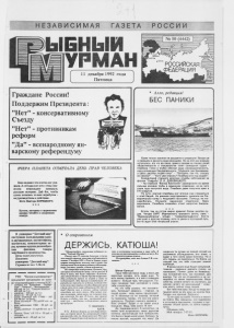 ж шшк. САМКТ • » n trtnvrr ттюплвполск КАМЧАТСКИЙ ШѴСПІІ ЫЕНЫИ ■УРМАН 11 декабря 1992 года Пятница ВЧЕРА ПЛАНЕТА ОТМЕЧАЛА ДЕНЬ ПРАВ ЧЕЛОВЕКА Еще недавно эта плетка нас уни жала. А сегодня кое-кто с этим сим волом возрождает казацкую, русскую историю. Дай бог, чтобы плеть осталась только атрибутом - не руководством к действию. Фото Виктора КОРЕЦКОГО. х х х Кстати, материал о мурманских казаках читайте в следующем номере. Ы ра пи • F C 7 ВОV Граждане России! Поддержим Президента: "Нет" - консервативному Съезду "Нет" - противникам реформ "Да" - всенародному ян варскому референдуму --------------------------------------------------- * А лло , редакция ! БЕС ПАНИКИ I Каких только звонков не раздается в редакции! Вроде уж и привыкли к разного рода сенсациям. Но на этот раз всерьез испугались: это что же такое, прямо в заливе на глазах у всей общественности и специалистов тонет громадное судно - плавбаза. Голос в трубке обличал нашу неосведомленность, нашу вопиющую бездеятельность: “Шуршите там бумажками, а здесь десятки людей тонут". - "Погодите, там что, спасать их некому?". - "Кого уже спасать? Плавбаза вся под водой!". Комментарий старшего капитана службы наблюдения за флотом "Севрыбы" В. И. ДУБОВИЦКОГО: - На плавбазе "Виктор Кингисепп" разморозили во время сильных холодов трубы в машинном отделении, из-за чего стала туда поступать вода. Плавбаза даже получила крен в 5-6 градусов. По сути, экипаж плавбазы мог вполне сам справиться с этой бедой. Но решили подстраховать: вызвали из Се вероморска катер с мощными насосами. Помощь не по надобилась. Осушили машинное отделение. Крен выровняли. Плавоаза спокойно стоит напротив Белока- менки. X X X Кстати, там на отстое мирно дремлют более десятка су дов. Четыре БМРТ Мурманского тралового флота, семь - "Мурманрыбпрома", четыре - "Севрыбхолодфлота". Кто-то уже ушел к другому хозяину, кого-то увели в последний путь, кто-то ждет этой печальной участи. *■ к. □ пЗО “Коопплодоовощторг” длатает продукцию по опто- I во-отпускной иене с учетом НДС: • колбаса п/к "Кубанская", "Украин ская", “ Казачья . "Москворецкая" - 435 руб. за 1кг, "Приднестровская" - 400 руб. за 1 кг;. • хурма св. - 100 руб. за 1 кг; • редис св. - 60 руб. за 1 кг; • джем сливовый ж/б 1/1000 - 247 руб.56 коп. за банку- • джем алычевый - 252 руб.80 коп. за банку; • икра кабачковая 1/650 - 49 руб. за банку; • томаты соленые - 31 руб.50 коп. за 1 • напиток “Лель" с/б 1/3 л - 53 руб. с посудой; • гранаты св.ст. - 65 руб. за 1 кг. В универмаг “Детский мир” поступили холодильники одно- и двухкамерные, магнитофоны, магнитолы, компьютерные иг ры, пуховые куртки разнообраз ных фасонов, товары зарубежного производства. Цены ниже рыночных. Посетите универмаг “Детский мир”. Справки по тел. 7-30-16. * О сокровенном ДЕРЖИСЬ, КАТЮША! ‘ Здравствуйте, уважаемая редакция га зеты "РыбныйМурмая”! Пишет вам 15-летняя девчонка. А пишу я по поводу статьи, которая опубликована в газете 27ноября 1992 г. Кнейя, думаю, имею прямое отношение, потому что я ровно две неделиназад былаизнасилованау себя вквар тире (только, правда, одним человеком). Вынаверняка шокированы. Конечно, дру гая сразужеподала бы заяву. Ляне смогла. Я была в шоке, мне было страшно. Я подели лась этимтолько с двумя-тремя подругами. Мои родители ничего не знают и даже не подозревают. Мне друзья посоветовали об ратиться к юристу, но я боюсь, потому что есть несколькопричин, чтобыобвинитьменя в том, что я его сама собла