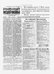 отельный экз. V Пролетарии всех стран, соединяйтесь 1 V РЫБНЫЙ I а Да здравствует 1 Мая—день ОРГАН ПОЛИТОТДЕЛОВ ТРАЛОВОГО И СЕЛЬДЯНОГО ФЛОТОВ И ГЛАВМУРМАНРЫБПРОМА № 52(136 Цена 15 коп. международной солидарности трудящихся, день братства рабочих всех стран! Выше знамя пр олета р ско г о интернационализма! ПРАЗДНИК ТРУДА И МИРА Сегодня советский народ тор- j жественно празднует Первое Мая —день солидарности трудящихся ! всего мира, день братства рабочих всех стран. Радостью и гордостью переполнены сердца советских людей за свою великую Родину. С каждым днем все более укрепляет ся могущество нашего социалисти ческого государства, повышается уровень социалистической эконо мики и культуры, неуклонно рас тет благосостояние трудящихся. Под руководством Коммунисти ческой партии и Советского прави тельства наша социалистическая держава добилась всемирно-исто рических побед. Довоенный уро вень народного хозяйства остался далеко позади. В прошлом году объем промышленного производ ства в Советском Союзе уже в два с половиной раза был выше, чем в 1940 году. За истекшие три года пятой пятилетки выпуск промыш ленной продукции увеличился на 45 процентов, при этом производ ство средств производства возрос ло на 46 процентов, производство предметов потребления — на 43 процента. Неуклонно, из года в год улуч шается благосостояние советских людей, все краше, ярче и счастли вее становится наша жизнь. Толь ко за последние три года реальная заработная плата рабочих и слу жащих выросла на 30 процентов, а общая сумма доходов рабочих и служащих и доходов крестьян в сопоставимых ценах выросла на 34 процента. Это яркий показатель того, что советский народ стремит ся к мирному, созидательному тру ду. Все его помыслы и усилия на правлены на строительство ком мунизма. Партия и правительство органи зуют ускоренное развитие легкой и пищевой промышленности с та ким расчетом, чтобы в течение ближайших двух — трех лет резко повысить обеспеченность населе ния продовольственными и про мышленными товарами. Осуществ ляя это указание, работники пред приятий рыбной промышленности Мурманского бассейна на основе социалистического соревнования добились значительных успехов. Моряки сельдяного флота 17 ап реля завершили четырехмесячную программу вылова рыбы, а к 26 апреля выполнили апрельский план. Значительное количество средних траулеров закончили вы полнение пятимесячных и полуго довых заданий. По итогам сорев нования за первый квартал 1954 года управлению «Мурмансельди» присуждена первая Всесоюзная премия. Досрочно завершена четырехме сячная программа и апрельский план моряками тралового флота. Государство получило значитель ное количество сверхплановой рыбной продукции. С хорошими показателями при шли к международному празднику Первое Мая работники судоре монтного завода Главмурманрыб- прома. За свой самоотверженный труд по ремонту промыслового флота коллектив завода удостоил ся первой Всесоюзной премии за первый квартал 1954 года. Работники рыбного Мурманапо- ! стоянно ощущают отеческую забо ту партии и правительства о даль нейшем развитии рыбной промыш ленности в Заполярье, о система- | тическом улучшении культурных и бытовых условий моряков, рыбо обработчиков, портовиков, судоре монтников. Промысловый флот по полняется новыми могучими кораб лями, осна