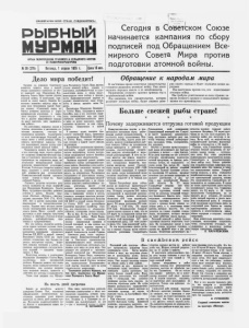 ПРОЛЕТАРИИ ВСЕХ СТРАН, СОЕДИНЯЙТЕСЬ! РЫБНЫЙ ОРГАН ПОЛИТОТДЕЛОВ ТРАЛОВОГО И СЕЛЬДЯНОГО ФЛОТОВ И Г ЛАВМУРМАНРЫБПРОМА №39 (279) Пятница, 1 апреля 1955 г. Цена15коп. Сегодня в Г«й?ай;. гц . ЕкД ОС С Р Союзе начинается кампания по сбору подписей под Обращением Все­ мирного Совета Мира против подготовки атомной войны. |,ело мира победит! Сегодня по решению Советского к-оштета защиты мира в надпей стране начинается кампания по сбо­ ру подписей под Обращением Все­ мирного Совета Мира против угрозы атомной войны. В резолюции, при- нием Всемирного Совета Мира против угрозы атомной войны, моряной и порто<викп, рыбообработчики (и судо­ ремонтники BHoiBb и вновь проде­ монстрируют свою любовь и предан­ ность Коммунистичес&он партии и Обращение к народам мира нятой по этому поводу, Пленум Со- родному правительству, сшю готов- ветского комитета защиты мира от ность и впредь крепить силы Ро- лица всех трудящихся нашей Рода- даны, ны заявил: «Советский н ар д не Подписывая Обращение Всемирно- боится атомного шантажа и угроз го Совета Мира, трудящиеся нашего американских агрессоров и выра- бассейна, как и все советские граж- жает твердую уверенность в том, дане, подтверждают еще раз свою что и другие миролюбивые народы глубокую заинтересованность жить не дадут запугать себя поджигате- в мире со всеми народами, самоот- лям войны». верженно трудиться во имя строи- Эта резолюция, выражая мысли и тельства коммунизма в нашей чувства миллионов и миллионов со- I стране, ветских патриотов, отвечает их В настоящее время некоторые правительства готовятся развязать атомную войну. Они хотят внушить народам мысль о ее неизбежности. Применение атомного оружия привело бы к истребительной войне. Мы заявляем, что правительство, которое развяжет атомную войну, будет лишено дове­ рия своего народа и будет осуждено всеми на­ родами. Мы выступаем против тех, кто подготовляет атомную войну. Мы требуем уничтожения во всех странах з а ­ пасов атомного оружия и немедленного прекра­ щения его производства. Больше свежей рыбы стране! ☆ ☆ ☆ Почему задерживается отгрузка готовой продукции Коммунистическая партия и пра- j Руководители этой организации | личества тележек тормозит работу О высоких целях, которые пре- ! вительство поставили перед работ-1 (управляющий конторой тов. Гущян) (грузчиков. Напрямер, 29 марта груз- стремлению защитить человечество Iследует советский народ, приступая | никами рыбной промышленности, в не могут правильно организовать ! чикам не на чем было подвозить мо- заводе приводятся в действие все резервы, способствующие увеличе­ нию выпуска охлажденной и моро- тонн готовой продукции. В ближай- от всех неисчислимых бедствий, ко- к подписанию Обращения Всемирно- торые несет с собой атомная война, го Совета Мира, говорят публикуе- сорвать преступные замыслы тех, мые сегодня в нашей газете письма кто вынашивает подлые планы раз- трудящихся. вязывания новой мировой бойни. Партийнные организации призваны Трудящиеся нашего бассейна, как возглавить новый патриотический и все советские люди, горячо одобря- подъем трудящихся, помочь коллеж- ют политику Коммунистической пар- тшвам предприятий нашего бассейна т и и и Советского правительства, на- выполнить свои обязательства, правленную на сохранение мира, на Особенно широкий размах должна ослабление международной напр