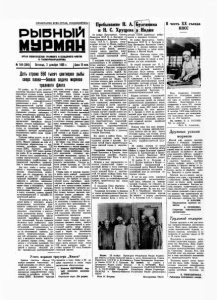 ПРОЛЕТАРИИ ВСЕХ СТРАН. СОЕДИНЯЙТЕСЬ! I РЫБНЫЙ Пребывание Н. АЛБулганина и Н. С. Хрущева (э 25 ноября Председатель Совета i ветских "гостей закончился фейер- Минпстров СССР Н. А. Булганин и верком и народным гуляньем, член Президиума Верховного Совета I 26 ноября Председатель Совета Союза ССР И. С. Хрущев, совер- Министров СССР Н. А. Булганин и шающие поездку по Индии, прибыли I цлен Президиума Верховного Совета в Пуну — один из ^крупнейших I (ХХЗР Н. С. Хрущев прибыли само- городов штата Бомбей, древнюю I лотами в Бангалор — центр штата столицу народа мараттов, ныне |Майсора в Южной Индии. В честь XX съезда КПСС ОРГАН ПОЛИТОТДЕЛОВ ТРАЛОВОГО И СЕЛЬДЯНОГО ФЛОТОВ И ГЛАВМУРМАНРЫБПРОМА №144 (384)I Пятница, 2 декабря 1955 г. центр сельскохозяйственного рай она и важный культурный центр страны. С аэродрома гости направились на i 1 с .расположенную в 30 километрах от Ц8На 15 КОП* 1 Пуны опытную сельскохобяйетвен- Жители Бангалора горячо при ветствовали советских гостей во время их проезда по городу в отве денную для них резиденцию. Во второй половине дня Н. С. Дать стране 550 тысяч центнеров рыбы сверх плана— боевая задача моряков тралового флота 28 ноября, на 33 дня досрочно, подъемами, которые могли обеопе- коллектив тралового флота закончил выполнение (годового плана добычи рыбы. Эта производственная победа является результатом широко раз вернувшегося социалистического соревнования в честь XX съезда Коммунистической партии Совет ского Союза, самоотверженного тру да моряков, их непреклонного стремления успешно претворить в жизнь исторические решения июль ского Пленума ЦК ШЮС. Большая роль в достижении этого успеха принадлежит партийным органи зациям, которые мобилизуют про мысловиков ва борьбу за высокие уловы, на повышение творческой активности, проводят значительную политическую работу среди труже ников моря. Трудовая победа (радует, но не ус покаивает коллектив тралового флота. Моряки приняли на себя от ветственные обязательства — под готовить достойную встречу XX съезду КПСС, выловить дополни тельно к плану 550 тысяч центне ров рыбы. И на решении этой зада чи должны быть сосредоточены все усилия многотысячного коллектива промысловиков, хозяйственных ру ководителей, партийных, профсоюз ных и комсомольских организаций. ■Для того, чтобы с честью спра виться с ответственным предсъез довским обязательством, необхо димо, как это указывалось на про шедшей на днях XVII Мурманской городской партийной конференции, ную станцию в (Вадгаоне, созданную Хрущев и Н. А. Булганин посетили департаментом сельского хозяйства индийский научный институт в правительства штата Бомбей. На Бангалоре. После осмотра гостями этой станции специально изучаются различных отделений этого инсти- проблемы рисоводства, имеющие тута его директор^ профессор большое значение для Индии, где К- Сринивасан и Н. С. Хрущев в посевная площадь ржа достигает 70 присутствии-многочисленных гостей миллионов акров (28 миллионов га), обменялись краткими речами. Затем Затем товарищи Булганин и Н. А. Булганин и Н. С. Хрущев по- Хрущев вместе с сопровождающими еетили одно из многих промышлен- их лицами посетили эксперимен- НЬ1Х предприятий Бангалора тальную гидроэнергетическую стан- станкоинструментальный завод. цию близ Пуны, находящуюся в ве- Позднее состоялся «гражданский чить выполнение плана, и в ко