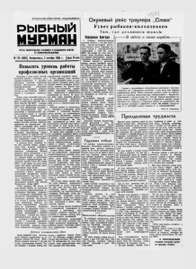 ПРОЛЕТАРИИ ВСЕХ СТРАН, СОЕДИНЯЙТЕСЬ! РЫБНЫЙ ОРГАН ПОЛИТОТДЕЛОВ ТРАЛОВОГО И СЕЛЬДЯНОГО ФЛОТОВ И ГЛАВМУРМАНРЫБПРОМА №118 (358)I Воскресенье, 2 октября 1955 г. | Цена 15 коп. Повысить уровень работы профсоюзных организаций Объединяя в своих рядах десятки миллионов рабочих, служащих, ин­ женерно-технических и научных работников, советские профсоюзы проводят многогранную работу по коммунистическому воспитанию трудящихся, принимают активное участие во всех областях хозяйст­ венного и культурного строитель­ ства. Теперь, когда советский народ на­ стойчиво борется за претворение в жизнь исторических решений июль­ ского Пленума ЦЕ КПСС, особенно велика роль профсоюзных организа­ ций в деле мобилизации трудящих­ ся на самоотверженный труд, на выполнение и перевыполнение про­ изводственных планов и заданий, на дальнейший технический про­ гресс промышленности. На ряде предприятий и траулеров нашего бассейна местные комитеты профсоюзов под руководством пар­ тийных организаций умело руково­ дят социалистическим соревнова­ нием, проявляют заботу о культур­ но-бытовом обслуживании трудя­ щихся, борются за здоровый быт, за крепкую трудовую и производствен­ ную дисциплину, следят за выпол­ нением коллективных договоров. В траловом флоте, например, бо­ лее трех десятков команд промыс­ ловых судов досрочно завершили годовые планы по 'добыче рыбы и выработке субпродуктов. Моряки тралового флота изыскивают и мо­ билизуют внутренние резервы, ве­ дут упорную борьбу за выполнение повышенных социалистических обя­ зательств, взятых в честь XX съезда КПСС, и уже имеют на своем счету свыше 450 тысяч центнеров рыбы, выловленной сверх плана. Но нельзя пройти мимо серьезных недостатков в работе профсоюзных организаций предприятий рыбной промышленности. Они были вскры­ ты и подвергнуты резкой и совер­ шенно справедливой критике на проходившем недавно VIU пленуме Мурманского обкома КПСС. Особое внимание VIII пленум об­ кома партии обратил на недостатки в руководстве социалистическим со­ ревнованием. Некоторые профсоюз­ ные организации ограничивают свое руководство соревнованием тем, что организуют принятие обязательств и от случая к случаю, причем не­ редко кабинетным порядком, без участия соревнующихся, подводят итоги их выполнения. Комитеты профсоюзов не проявляют заботы о создании соревнующимся админи­ страцией предприятий и кораблей необходимых условий для высоко­ производительного труда, не следят за освоением и внедрением новой техники и технологии, рационали­ заторских предложений, механиза­ цией трудоемких процессов труда, слабо занимаются изучением и рас­ пространением передового опыта. К чему приводит такое «руковод­ ство» соревнованием видно на при­ мере работы сельдяного флота. Здесь базовый комитет профсоюза (предсе­ датель комитета тов. Шутов) огра­ ничивал свое руководство соревно­ ванием принятием социалистиче­ ских обязательств и ежемесячным подведением его итогов. Он прохо­ дил мимо таких, например, фактов, когда промысловики снабжались недоброкачественными сетематериа- лами, да и то в недостаточном коли­ честве. Базовый комитет не интересовал­ ся освоением и внедрением новой техники и технологии. Неудиви­ тельно поэтому, что установленные на кораблях современные приборы для поисков сельди многими экипа­ жами не