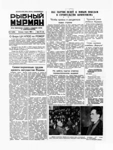ПРОЛЕТАРИИ ВСЕХ СТРАН. СОЕДИНЯЙТЕСЬ! РЫБНЫЙ ОРГАН ПОЛИТОТДЕЛОВ ТРАЛОВОГО И СЕЛЬДЯНОГО ФЛОТОВ И ГЛАВМУРМАНРЫБПРОМА №27 (423) Пятница, 2 марта 1956 г. Цена 15 коп. НАС ПАРТИЯ К НОВЫМ ПОБЕДАМ В СТРОИТЕЛЬСТВЕ КОММУНИЗМА ☆ Чтобы крепла и расцветала наша страна О Бюро ЦК КПСС по РСФСР В целях более конкретного руководства работой республиканских организаций, областных, краевых партийных, советских и хозяйствен ных органов и более оперативного решения вопросов хозяйственного и культурного строительства Российской Советской Федеративной Социа листической Республики Центральный Комитет КПСС создал Бюро ЦК КПСС по РСФСР. Председателем Бюро ЦК КПСС по РСФСР утвержден Первый секре тарь ЦК КПСС тов. Хрущев Н. С. и заместителем Председателя Бюро — секретарь ЦК КПСС той, Беляев Н. И. Членами Бюро ЦК КПСС по РСФСР утверждены тт.: Яснов М. А. — председатель Совета Министров РСФСР, Капитонов И. В. — первый сек ретарь Московского обкома КПСС, Козлов Ф. Р. — первый секретарь Ленинградского обкома КПСС, Чураев В. М. — зав. Отделом партийных органов ЦК КПСС по РСФСР, Мыларщиков В. П. — зав. Сельскохозяйст венным отделом ЦК КПСС по РСФСР, Пузанов А. М. — первый замести тель Председателя Совета Министров РСФСР, Игнатов Н. Г. — первый секретарь Горьковского обкома КПСС, Кириленко А. П< — первый сек ретарь Свердловского обкома КПСС. — ■ * - . . . Самоотверженным трудом крепить могущество Родины Трудящиеся рыбного Мурмана, делами отвечают на решения XX как и все советские люди, горячо съезда партии. Коллектив тралового одобряют исторические решения XX флота досрочно завершил февраль- съезда Коммунистической партии ское задание, промысловики «Мур- мансельди» близки к завершению Состоялся общепортовый митинг, посвященный окончанию работы XX съезда Коммунцстичесюой партии Советского Союза. Митинг открыл заместитель секретаря партийного бюро порта тов. Данилов, предоста вивший слово секретарю Мурманск», го обкома КПСС тов. Анисимову. Он говорит об огромном значении XX съезда КПСС, решения которого сы грают большую роль в развитии на- родното хозяйства Советского Сою за., в улучшении материального бла. госостояния советского народа. — Решения съезда,— говорит тов. Анисимов. — вооружают нас еще более глубоким пониманием происходящих событий, вселяют твердую уверенность в успех вели кого дела строительства коммуни стического общества в нашей стране. На трибуне — кузнец механиче ских мастерских автобазы порта тов. Разин, который указывает, что со ветские люди горячо одобряют исто рические решения XX съезда КПСС, направленные на всемерное развитие производительных сил нашей Роди ны, на удовлетворение все возраста ющих материальных потребностей советского народа. , — Много внимания и заботы, — говорит тов. Разин, — партия и правительство проявляют о разви тии рыбного Мурмана. Отвечая на ,эту заботу, портовики должны рабо тать еще лучше, чтобы с честью осуществить задания первого года шестой пятилетки. Я лично прини маю на себя обязательство выпол нять сменные задания не менее чем на 300 процентов и призываю по следовать моему примеру всех рабо чих автобазы. Бригадир грузчиков сольеклада тов. Кузнецова рассказала, с каким большим вниманием следили порто- пики за работой XX съезда Комму нистической партии Советского Союза. — Намечаемое партией и прави тельством сокра