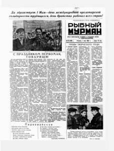 Да здравствует 1 Мая—день международна, пролетарской солидарности трудящихся, день братства рабочих всех стран! ЩШШ >;1 : • Ш & т е I " . : ПРОЛЕТАРИИ ВС ЕХ СТРАН, СОЕДИНЯЙТЕСЬ! РЫБНЫЙ ОРГАН ПОЛИТОТДЕЛОВ ТРАЛОВОГО И СЕЛЬДЯНОГО ФЛОТОВ И ГЛАВМУРМАНРЫБПРОМА №52(448) Вторник, 1 мая 1956 г. Цена 15 коп, ПЛОДЫ ТВОРЧЕСКОГО ТРУДА С полным грузом С ПРАЗДНИКОМ ПЕРВОУЧАЯ, Т О В А Р ИЩ И ! Эти слова приветствия звучат се годня на разных языках во всех странах и на всех континентах. Ра достный и светлый праздник — праздник мира, труда и весны —« отмечают повсюду на земном шаре. И везде можно услышать пламенный призыв: — Да здравствует 1 Мая — день международной пролетарской соли дарности трудящихся, день братства рабочих всех стран! Выше знамя пролетарского интер национализма! Пролетарии всех стран, соединяйтесь! Осененные ленинским знаменем пролетарского интернационализма, Коммунистические партии уверенно возглавляют широчайшие народные массы в их борьбе за мир и свободу, за демократию и социализм. Ныне главную черту нашей эпохи состав- 1 яет выход социализма за рамки од ной страны и превращение его в ми ровую систему. Успехи мирового лагеря социализ ма в развитии экономики, культуры и подъема материального благосо стояния демонстрируют перед всем миром решающее превосходство со циалистической системы над систе мой разлагающегося капитализма. Международный праздник трудя- цнхся 1 Мая советские люди отме- 1 ают в нынешнем году в обстановке иромного политического и трудового юдъема, вызванного работой XX ъезда Коммунистической партии Советского Союза, его исторически- HI решениями. Эти решения пред ставляют собой боевую программу дальнейшей борьбы за построение юммунистического общества в на лей стране, за упрочение мира во сем мире, за торжество великих дей ленинизма. Наша Родина находится сейчас на овом мощном подъеме, замечатель- ым подтверждением этого является публикованное в канун первомай- кого праздника Сообщение об итогах ыполнения пятого пятилетнего пла- а развития СССР на 1951— 1955 оды. В результате успешного за вершения пятой пятилетки Совет-' ский Союз далеко превзошел довоен- ] ный уровень развития народного хо зяйства. Директивы XX съезда КПСС по шестому пятилетнему плану ставят новые величественные задачи перед советским народом. Объем промыш ленной продукции за новую пяти летку увеличится примерно на 65 процентов. Преимущественное раз витие получит тяжелая индустрия — основа основ социалистической экономики, укрепления обороноспо собности Советского государства, ис точник повышения благосостояния народа. Вместе со всеми советскими людь ми настойчиво борются за осу ществление исторических решений XX съезда партии трудящиеся рыб ного Мурмана. На предприятиях бас сейна все шире развертывается со ревнование за досрочное выполнение заданий шестой пятилетки. Творче ская активность и инициатива про мысловиков и рыбообработчиков,* портовиков и судоремонтников при носит замечательные плоды. Коллек тивы тралового и сельдяного флотов, рыбного порта и ряда других пред приятий, готовя достойную встречу Первомаю, досрочно справились с четырехмесячной программой. Эки пажи траулеров «Добролюбов», «Некрасов», средних траулеров Лй!Мг 4214, 683, 4165 рапортовали уже о выполнении полугодового плана. Успехи, которых добились за пер. вые месяцы ше
