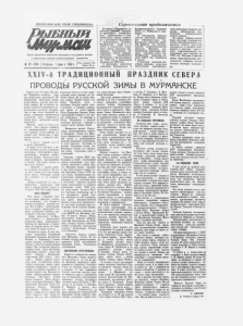 ■А Г ПРОЛЕТАРИИ ВСЕХ СТРАН, СОЕДИНЯЙТЕСЬ! Ш т н ьт Соревнование продолжается Орган партийных комитетов тралового и сельдяного флотов и управления рыбной промышленности совнархоза нн, 1а п р е 1958 г. Год издания 5-й Цена 15 к. 28 марта в Мурманске со стоялось^сабранЯе городско го партийного, хозяйствен ного, профсоюзного и ком сомольского актива совмест но с делегацией трудящихся г. Калининграда, созванное Мурманским горко м о м КПСС и исполкомом город ского совета депутатов тру дящихся, посвященное об суждению итогов социали стического соревнования Мурманска с Калининградом за 1957 год и заключению договора на 1958 год. С докладами выступили секретари Мурманского и Калининградского горкомов КПСС тт. Мамруков н Дру жинин. В обсуждении приняли участие начальник управле ния «Мурмансельдь» тов. Бородулин, работница швей ной фабрики тов. Зверева, капитан рефрижераторного траулера «Витебск» тов. Требушиый, крановщик мор ского торгового порта тов. Трофнменко, секретарь об кома КПСС тов. Коновалов и другие. С большой теплотой уча стники собрания встретили выступление калининград ского бригадира маляров, но ватора производства тов. СтрукоЕа, поделившегося опытом работы. Во время работы актива была получена телеграмма с сессии Калининградскогс го родского Совета депутатов трудящихся, в которой сооб щалось о решении продол жить социалистическое со ревнование двух городов на 1958 год. Обсудив и приняв новые социалистические обя зательства .собрание актина послало ответную телеграч- му. XX IV-й ТРАДИЦИОННЫМ ПРАЗДНИК СЕВЕРА ☆ ПРОВОДЫ РУССКОЙ ЗИМЫ в МУРМАНСКЕ Хмурое утро 30 марта. На ули- Советского Союза и в этих сорев- сти, среди которых много талант- в составе Т . Баланина, В. Мито- первой степени и звание чемпиона даос Мурманска, необычно даже нованиях вновь завоевал это по- ливой молодежи. хина, В. Смирнова и А. Нестеро- XXIV традиционного Праздника для воскресенья, многолюдно. На четное звание. Но не будем забе- ...Дан старт лыжных гонок для ва. Второе место завоевали спорт- Севера. центральной магистрали города, гать вперед. Скажем только, что мужчин 4 по 10, в котором уча- смены Северного флота и третье Федор Михайлович неоднократ- улице Ленина, людская река осо- Федор Терентьев, здесь в ствует тринадцать сильнейших место вторая команда ДСО ный призер гонок на оленьих уп- бенно широка. На остановках го- Заполярье, получил первое «бла- лыжных команд. Одновременно «Труд». В эстафете 3 по 5 для ряжках. Дома у него красуются рожане пытаются штурмовать пе- гословение» в большую спортив- разыгрывается первенство Совет- женщин звание чемпиона Праз- два самовара, время показывают реполненные автобусы. Большин- ную жизнь от своего тренера ского Союза и первенство Праз- дника Севера завоевала сборная несколько именных часов. Все это ство из них, после очередной по- Павла Назаровича Синцова. После дника Севера. Начинаются лыж- команда Северного флота в соста- — реликвии его спортивной сла- пытки, отчаявшись протиснуться соревнований чемпион и его тре- ные гонки женских команд 4 по ве А. Егуповой, Ф. Валеевой, вы. в. заветную дверь, вливаются в Нер встретились на квартире у 5, борющихся также за первенст- Е . Смодяииноеой. Хороший результат показал общий поток празднично одетых Павла Назаровича, и молодой во Советского Союза, одновремен- ОЛЕНЬИХ УПРЯЖКАХ оленевод колхоза