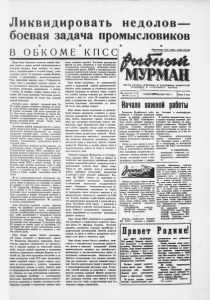 Ликви а », ировать недолов боевая задача промысловиков В О Б К О М Е К П С С Вчера бюро областного комитета партии обсу дило вопрос о работе рыбной промышленности в четвертом квартале. Бюро отметило, что трало вый и сельдяной флоты в осенний период резко ухудшили работу. В результате рыбаки Мурмана отстают в соревновании с дальневосточниками. -Суда управления морского лова и Рыбакколхоз- союза, хотя и выполняют плановое задание, но не использовали полностью благоприятную про мысловую обстановку, сложившуюся в октябре •^-ноябре. За октябрь— ноябрь недолов рыбы со ставил 180 тысяч центнеров. Торгующим органи зациям недопоставлено 14 тысяч тонн пищевой рыбной продукции. Особенно плохо работает траловый флот. Па 30 ноября задание четвертого квартала по выло ву рыбы флотом выполнено лишь на 53 процента. И недолов составляет 140 тысяч центнеров ры бы. Под угрозу срыва поставлено не только вы полнение социалистического обязательства, но и годового государственного плана. За эти же два месяца сельдяной флот недодал стране более 80 тысяч центнеров сельди. Отставание рыбной промышленности в выпол нении квартального плана и социалистических обязательств является результатом не столько ухудшения сырьевой базы, сколько следствием ослабления партийно-организационной и воспита тельной работы среди моряков, неудовлетвори тельного использования промыслового флота и сырьевой базы. Бюро областного комитета партии отметило, что руководители главка «Севрыба», Мурманский и Североморский горкомы КПСС, партийные орга низации флотов и береговых предприятий не мо билизовали коллективы на выполнение мероприя тий по сверхплановому вылову рыбы в четвертом квартале текущего года, утвержденных секрета риатом обкома КПСС в начале октября. На про тяжении двух месяцев количество судов в море было значительно меньше планового: в траловом флоте —• в среднем на 13,5 судов, в «Мурман- сельди» в конце ноября недоставало более 10 судов. Из-за неудовлетворительной организации про изводства, неправильного использования плавучих доков, брака и переделок на судоверфи не вышли из ремонта в срок 12 судов тралового флота и 5 СРТ управления «Мурмансельдь». 13 трауле ров в октябре и 12 в ноябре выведены из экс плуатации из-за неудовлетворительного техниче ского состояния и аварий. Полярный институт и гидрометеослужба не обеспечивают флоты четким и оперативным прогнозированием. Их прогнозы не всегда оправдывались. Бюро областного комитета партии отметило также, что партийные организации предприятий рыбной промышленности плохо осуществляют контроль хозяйственной деятельности администра ции, слабо воспитывают у трудящихся чувство ответственности за порученное дело, за комму нистическое отношение к труду. Медленно рас пространяют опыт передовиков. В результате план 10 месяцев по вылову рыбы не выполнили 117 экипажей. Ни один из трех рыболовецки! колхо зов Североморского района не справился с пла ном добычи рыбы. Бюро обкома партии обязало руководите- • • * • лей главка «Севрыба» и промысловых флотов (тт. Филиппова, Закурдаева, Бородулина, Немы- чеикова, Андреева) сосредоточить все материаль ные к людские резервы на увеличения вылова рыбы, выпуске рыбной продукции и выполнении принятых обязательств рыбаками Мурмана на те кущий год. Для этого предложено обеспечить в