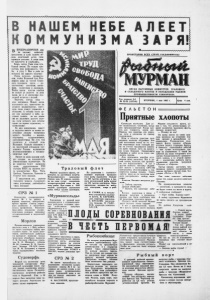 Тр а л о в ы й ф л о т Моряки тралового флота, со ревнуясь за достойную встречу Международного праздника Первое мая, 28 апреля, досроч но на двое суток, завершили четырехмесячный план по вы лову рыбы. При плане в 1842 тысячи центнеров выловлено рыбы 1843,2 тысячи центнеров. «Мурмансельдь» Ежедневно в родной порт возвращаются с перевыполнен ным рейсовым заданием сред ние рыболовные траулеры «Мурмансельд и ». На днях с полным грузом пришли в порт СРТ №№ 714, 4239, 720,- 846. Большим тру довым успехом встречают свет лый Первомай инициаторы пред майского соревно вания — моряки сельдяного флота. Накануне праздника в управ ление «Мурмансельди» пришла радостная весть: коллективу сельдяного флота по итогам первого квартала присуждено переходящее Красное знамя Совета Министров РСФСР и ВЦСПС, первая денежная пре мия. СРЗ № 2 Во время предмайского со ревнования коллектив судоре монтного завода № 2 не за держал ни одного судна в ре монте сверх установленного срока. Апрельский план в це лом по заводу выполнен на 108,5 процента. Ф. МАСТИНИН, председа тель завкома. соответст- прошлого По сравнению с вующим периодом года рыбы выловлено больше на 182 тысячи центнеров, а вы пуск охлажденной рыбы возрос на 123 тысячи центнеров. Пере выполнены задания по -выпу ску консервов, жира и рыб- муки. Я. ГУНИН, и. о. началь ника управления тралово го флота, И. БЕРЕЗИН, зам.секретаря парткома, Б. КИСЕЛЕВ, председа тель базкома, П. ГОЛУ БЕВ. секретарь комитета ВЛКСМ. Календарь неумолим. Дни ле- Моряки сельдяного флота, уз- тят молниеносно. Особенно, когда нав о том, что демонстрацию от- они предпраздничные. Когда хло- кроет коллектив тралового флота, пот, как говорится, полон рог. сначала возроптали: Правда , они приятны, эти хлопо- — Почему не мы? ты, хотя и различны по своему Но весна мигом на своих кры- еодержанию. льях ПрИНесла им утешение: пср- Всем в области известны дела ВуЮ премию в предмайском со- моряков экипажа «Куреики». Это ревновании. Руководители сель- они возглавили поход за то, чго- д ЯНОго флота сказали: «Ладно, бы надоевшую всем соленую ры- уступим дорогу старшему брату», бу на столах трудящихся замени- и занялись свалившейся -заботой ла рыоа свежая . За то на капитз- — как л у чш е . использовать пре- на судна Владиля Кирилловича мию по назначению. С такой же Лысенко и за^от из-за этого сва- заботой мы рады поздравить кол- лилась прорва. лектив Кандалакшского механиче- Д л я передового корабля уста- СКОго завода , а со второй премн- новлен фонд капитана. Вот и ду- — коллективы рыбного порта, май теперь, капитан, как правиль- управления морлова, траулеров но его израсходовать. А тут и «Л о сось» и «Херсон». другая новость: экипажу «Курен- _ поемии достались tdv - ки» вместе с экипажем СРТ-720 третьи премии достались тру присуждены облсовпрофом и сов- « ени к ам первого судоремонтного нархозом первые премии. Опять завод а> орудии лова, тра- забота: надо ее по заслугам каж - УлеРов <<Мста> к № 441* дого распределить между моря- Они тоже занялись заботами к а **и. _ вроде тех, какие одолели капитана Капитан Лысенко жалуется дру- п зьям: Лысенко. — Заботы одолели. Но предпраздничные хлопоты Дру зья убеждают: — хлопотами, а промысел-то ведь — Ничего, это приятные забо- будет стоять на месте и ждать . С побережья сообщают: Кстати, хлопотами в связи с фондом капитана в предпразд ничные дни были озабочены еще Иде