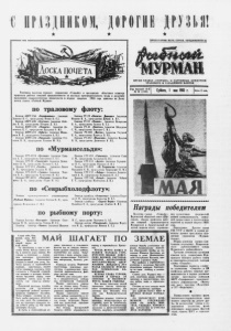 ПАРТИЙНЫХ КОМИТЕТОВ ЯНОГО ФЛОТОВ , издания |2-й № 52 (1545) ПРОЛЕТАРИИ ВС ЕХ СТРАН, СО ЕДИНЯЙТЕСЬ] Решением коллегии главного управления «Севрыба» и президиума областного комитета профсоюза рабочих пищевой промышленности за высокую производительность труда и досрочное выполнение социалистических обязательств в нервом квартале 1965 года зажжены иа Доску почета газеты «Рыбный Мурман» по траловому флоту: Экипаж БМРТ-256 «Серафимович» (капитан *Хаценко Б. С., предсудкома Иткин Б. С.). ! Экипаж БМР'Г-406 «Спутник» (капитан Лебе- ■дев Е. Н., предсудкома Бочаров Д. В.). Экипаж БМРТ-410 «Планета» (канитан Де ментьев К. Г., предсудкома Касьянов Р. М.). Экипаж БМРТ-411 «Орбита» (капитан Шима- ■наев И. В., предсудкома Пономарев А. В.). ! Экипаж БМРТ-416 «Кольский» (капитан Сте- 5панов В. В., предсудкома Русаков Ю. В.). Экипаж РТ-19 «Напитан Демидов» (канитан Мошков Н. А., предсудкома Добряк А. П.). Экипаж РТ-27 «Пикша» (канитан Назаренко B. А., предсудкома Галкин В. Г.). Экипаж РТ-31 «Касатка» (канитан Шередека C. И., предсудкома Воронин С. И.). Экипаж РТ-208 «Восток» (капитан Слуцкий В. А., предсудкома Кравчук В. И.). Экипаж РТ-322 «Муначево» (капитан Крылов II. В., предсудкома Дшженков В -И.)- по «Мурмансельди»: Экипаж СРТ-4124 «Бепомор» (капитан Грид- 2нев А. Г., предсудкома Григоренко Г. С.). Экипаж СРТ-12 «Горностай» (канитан Демья- S hchko В. П., предсудкома Нылаев С. А.). Экипаж СРТ-713 «Голубь» (капитан Лямов «П. И., предсудкома Захаров И. К.). Экипаж СРТ-4122 «Тамань» (капитан Чере- 5пов Б. А., предеудкима Чумаченко В. А.). Экипаж СРТ-4218 «Пахтусов» (капитан Кли- “ м«нко Е. А., предсудкома Родин Н. А.). Экипаж СРТ-421 «Гольчиха» (капитан Сокк Л. М., предсудкома Акульчин Б. В.). Экипаж СРТ-151 «Ансай» (капитан Геращен- ко Е. С., предсудкома Вихарев А. И.). Экипаж СРГ-182 «М. Стерлингов» (капитан Макуркин В. И., предсудкома Свиридович В. М.). Экипаж СРТ-717 «Лебедь» (капитан Лишнев- ский А. В., предсудкома Цымляков В. А ). Экипаж CPT-34G «Белый» (капитан Зайцев Г. Т., предсудкома Шабельник Д. К.). по «Севрыбхолодфлоту»: Экипаж производственного рефрижератора ■«Рыбный Мурман» (капитан Оленев Б. П . , пред- ■судкома Нальченков Г. М.). Экипаж плавбазы «Атлантика» (капитан Луля- ев А. П., предсудкома Денисеня И. Д.). Экипаж плавбазы «Сергей Киров» (капитан Колюбаев Е. А., предсудкома Лужбин Ф. И.). по рыбному порту: Экипаж буксира «Быстрый» (капитан Ооло- шенко Н. П., предсудкома Томляк И. С.). Экипаж танкера «Канин» (капитан Шишлов И. С., предсудкома Черкунов А. А.). Экипаж катера «Посыльный» (капитан Моргу нов И. Д., профгрупорг Иванов Э. С.). О РГАН ГЛ А ВКА «С ЕВРЫ БА » И ТРАЛОВОГО И Год 2 коп. Награды победителям Коллегия главка «Севрыба», Карельский областной совет проф союзов, обкомы профсоюза рабо чих пищевой промышленности Мурманской и Архангельской об ластей подвели итоги соревнова- Слава тебе, Пер- день бое- братства вомаи вого МАЙ ШАГАЕТ ПО ЗЕМЛЕ на людей труда всей земле. Ты приходишь к нам в цве тении весны, блеске синего не ба, в шелесте алых знамен. На улицах и площадях — ликую щее половодье праздничных демонстраций. Невозможно усидеть в такой день дома. Хо чется шагать в первомайской колонне, чувствовать рядом плечо товарища, ошущать свою слитность с Родиной, страной, где впервые в истории челове чества трудовой народ стал хозяином земли, всех ее бо гатств, где строится комму низм. Нынешний праздник вдвойне радостен для тружеников предприятий рыбкой промыш 