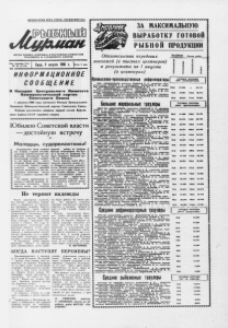 ПРОЛЕТАРИИ ВСЕХ СТРАН. СОЕДИНЯЙТЕСЬ! ц Л и ф л ш н ОРГАН ГЛАВКА «СЕВРЫБА» И ПАРТИЙНЫХ КОМИТЕТОВ ТРАЛОВОГО И СЕЛЬДЯНОГО ФЛОТОВ Гоа издания 12-й .№ 92 (17Ю) Цена 2 коп. ИНФОРМАЦИОННОЕ С О О Б Щ Е Н И Е О Пленуме Центрального Комитета Коммунистической партии Советского Союза 1 августа: 1966 года состоялся Пленум Центрального Комитета Коммунистическом партии Советской Союза, Пленум рассмотрел вопросы первой сессии Верхов ного Совета СССР седьмого созыва. власти достойную встречу ☆с Молодцы, судоремонтники! Семнадцатого июля капитал ток. Егоров, старший механмв секретарь парторганизации то». Безуглов, консервный мастер поедседатель судового комите та тов. Хохлов через газету &Рыбный Мурман» обратились к коллективу первого судоре монтного. завода с просьбой изыскать возможности для бы стрейшего окончания чистки котла и ремонта траулера «Бе луга». На заводе внимательно от неслись к просьбе моряков. За меститель начальника блока горячих цехов тов. Голубцов поруч*4 работу на траулере бригаде котельщиков тов. Кух- 1 ы в составе тт. Задорина, Ко- •№рт<% Маркенга. Ведущий про раб тов ВоблеякФ» . Чяекы бригады взяли облза тельство .закончить ремонт ког- ла 28 июля и успешно выполни ли его. 29 июля судно было гото во к выходу в море. Сверх пер воначального объема выпол нено исполнительно работ, в объеме 357 нормо-часов. Командование траулера оста лось довольно работой судоре монтников и выразило им благодарность. Не теряют надежды Часто приходится слышать, что многие траулеры, вернув шись с промысла, не выполни ли рейсового задания. Капита ны отстающих судов имеют привычку ссылаться на плохую промысловую обстановку, в то время как многие суда прихо дят в порт с грузом. Примером тому экипажи траулеров «Ка сатка» и сМарс». Эти суда си стематически выполняют свои рейсовые задания. Успех здесь кроется не только в организа торских и промысловых способ ностях капитанов, по и в добро совестном отношении рядового состава к своим обязанностям. В последнем рейсе моряки траулера «Марс» за тринад цать промысловых суток долж ны были добыть 82 тонны ры бы. Но трудовое старание команды перешагнуло плановые наметки, и траулер пришел в порт со 130 тоннами рыбы на борту. Правда, переходящее Крас ное знамя облсовпрофа прнш- 'лось уступить коллективу «Ка сатки». но моряки «Марса» не теряют надежды завоевать его снова. Для этого есть все воз можности. С полугодовым пла ном один из передовых экипа жей флога справился еще в се редине мая. Л совсем недавно моряки обязались ^49-летию Великого Октября дать годовой план. И нет сомнения, что эки пажу будет сопутствовать успех. И. ШУТИКОВ. КОГДА НАСТУПЯТ ПЕРЕМЕНЫ? * Пришвартовались к причалу в 12 часов 30 минут. На палубе — десять тонн сельди. Она не большая. но жирная. Выловили ее за один замет кошельковым неводом. Промышляли в заливе, и ходу в порт всего час-полто- ра. Жарко. Печет солнце. Не обходимо сразу приступить к разгрузке, но никто не торо пится. Ждем час, второй, тре тий... Наконец, пришел мастер по обработке рыбы. — Техническая. На муку, — бросил он небрежно, посмотрев на сельдь издалека. И поплыла стампа за стам- пой с сельдыо в кузов самосва ла. Промышляя в Мотовском за ливе, у побережья, мы сдавали свежую сельдь на плавбазы. Экипажи их хорошо промоют ЗА МАКСИМАЛЬНУЮ ВЫРАБОТКУ ГОТОВОЙ РЫБНОЙ ПРОДУКЦИИ сельдь, пересыплют солью и в бочки.