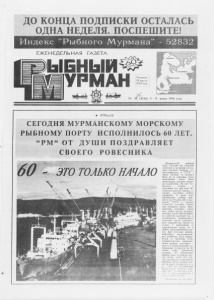 '.JT:4 llligrhj iiiiiiil .= kidxia li.i;:.;: mm EfcEfcljf КОНЦА ПОДПИСКИ .... .... TEia Индекс "Рыбного М урм ан а " - ЕЖ EH EД EЛ b H АЯ ГАЗ ЕТА Ы Б Н Ы И Основана 14 апреля 1934 года :: ( 4518 ) з - 9 июня 1994 года • Юбилей СЕГОДНЯ МУРМАНСКОМУ МОРСКОМУ РЫБНОМУ ПОРТУ ИСПОЛНИЛОСЬ 60 ЛЕТ. “ РМ “ ОТ ДУШИ ПОЗДРАВЛЯЕТ СВОЕГО РОВЕСНИКА Мурманский рыбный порт. Сегодня мы стыдливо опускаем в названии его са мую крупную награду, су ществовавшую в СССР - орден Ленина. А почему? Ведь не за красивые глаза начальника порта была присуждена высокая награ да коллективу. Ну нет Со ветского Союза, а портовики тут при чем? За служили высшую оценку, а, значит, достойны особого уважения. А ныне порт приобретает особую важ ность для России, ибо с рас падом СССР у нашего отечества остались только три основных порта. Мур манский занимает среди них особое место: незамер зающий залив обеспечивает его работой круглый год, а техническая оснащенность позволяет вести комплекс ную переработку грузов не только с рыболовных и транспортных судов, но и любых пакетированных гру зов. Два грузовых района, нефтебаза, железнодорож ное хозяйство, база перера ботки и хранения угля, плавмастерская, навигаци онная камера, портофлот - всего 15 подразделений, хо лодильные мощности на 40 тысяч тонн, множество складов, 56 портальных кранов плюс 12 кранов дру гих типов, почти 300 еди ниц различных погрузчиков, причалы общей длиной свы ше четырех километров и т. д. - все это сегодняшний Мурманский морской рыб ный порт. А еще надо ска- I чать о продолжающемся в