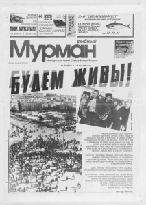 ТЕЛЕФОНЫ: 52-52-97 52-49-72 ЗЛО "ОКЕАНРЫ БФЛОТ СКУМБРИЯ 400-600 , (изготовитель Норвегия) ТРЕСКА, ПИКША, ПАЛ ТУС, КАМБАЛА, ЗУБА ТКА ОД ш ш Kvserner Kimek a.s КирхеМсс Тел +47 78 97 7100 Мурманск Тед 55-3S19 Архангельск. Тел 26-S2-86 еженедельная газета Северо-Запада России Осноёана 14 апреля 1934 /о<)п № 18 (4617) 5 - 1 1 мая 1996 года Нынче у каждого свой праздник. Получил зарплату, отдал долги, купил на радостях выпить и закусить, а наутро глядь - похмелиться-то уже и не на что... И все же 1 мая в Мурманске на Пять Углов вышли те, кто не хочет и не может забыть наших общих праздников. И дело здесь не в свободном труде, а тем более не в международной солидарности. Просто - весна, май, а значит - праздник. Таков он, Первомай образца 1996 года. Не очень шумный, не очень людный, но с гармонью и красными флагами. Через несколько дней эти флащ затрепещут на ветру на Зе^ у мурманского Алеши. День Победы - это святое. Это, пожалуй, единственный оставшийся наш общий праздник. Ну а сегодня. 5 мая. праздник у нас . более-менее опытных журналистов-газетчиков. Какая бы власть ни была на дворе, а пятого -День печати. Ну а там у коллег-радийцев День радио на носу... Вот и получается, что нынче у каждого свой праздник. Будем живы - не помрем!