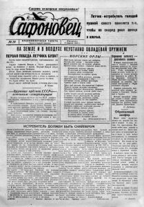 Смерть немецким оккупантам! №19 К Р А С Н О Ф Л О Т С К А Я Г А З Е Т А Прочти и передай товарищ у. Вт о р н и к 6 апреля 1943 г. ни1, тщ. — '.'«аил ■■■■■.................. • ■ Летчик - истребитель овладей пушкой своего самелета тгк, чтобы ее снаряд рвал в клочья. НА ЗЕМЛЕ И В ВОЗДУХЕ НЕУСТАННО ОВЛАДЕВАЙ ОРУЖИЕМ ПЕРВАЯ ПОБЕДА ЛЕТЧИКА БУЛАТ Группа наших самолетов заметила приближающихся дна «Ме*109». Старшие сержанты Наваров и Булат развернувшись вошли на сближение с врагом. Ведущий Назаров отк]ы.я огонь, но скоровышли боезапасы. Летчик Булат, расчетливо прикрывал ведущего, улучил удобный момент и дал меткую очередь но противнику. Подбитый немец стремился войти в облако и скрыться, но его самолет был неуправляем. Фашист рухнул на землю. Это первая победа тов. Булат. Второй самолет подбитый нашими летчиками упал в воду. Я ■Козин. — Вручение орденов СССР - летчикам - североморцам На-днях состоялись вручение орденов СССР летчикам североморцам, отличившимся в боях с немецкими захват чиками. В торжественной обстановке вручались высокие пра вительственные награды. 0 ] Д е н а Боевого Красного Зна мени получили: капитаны Бабий, Дорошин, гвардии к а питан Хрусталь иСорокин,старшийсержант Іінлипенко и др. Орден Отечественной войны _I ой степени получил майорАндрюшин. Выступавшие награждение заверили командование, что они оправдают и впредь высокое доверие партии и пра вительства, уничтожая наглого врага. М О Р С КИ Е ОРЛЫ Морскими орлами зовут нас недаром, - Носить это званье — высокая чеСть. Враги узнают нас по наиіим ударам , Крепка наша хватка, страиіна наша месть. Взмывают могучие крылья, И каждый на подвиг готов В атаку идет эскадрилья Бесстрашных полярных орлов. Под северным небом рокочут моторы, — Морские орлы защищают в бою Полярные скалы, родные просторы, Суровое море и землю свою. Орел над орлами, бесстрашный Сафонов Немало орлят молодых воспитал. Обломки кровавых фашистских драконов, Как черная падаль, лежат среди скал. Следы нашей смелой орлиной работы О наших делах рассказать бы могли — Сгоревшие склады , разбитые дзоты, Ушедшие к рыбам на дно корабли. Сжигай палачей, наше грозное пламя, Бушуй над врагами, смертельный пожар! Недаром зовут нас морскими орлами — Смелее в атаку, точнее удар! Взмывают могучие крылья, И каждый на подвиг готов. В атаку идет эскадрилья Бесстрашных полярных орлов! Вас. ЛЕБЕДЕВ-КУМАЧ. ИСТРЕБИТЕЛЬ ДОЛЖЕН БЫТЬ СНАЙПЕРОМ Одним из требований, предъяв ляемых современным воздуш ным боем к летчикам-истре- бителям, является автоматизм в его работе. Несколько секунд, в тече нии которых летчик атакует самолетнеприятеля, он не мо жет тратить на то, чтобы вспомнить где находится нуж ный тумблер, кнопка или ру коятка. сЬ'у приводит к тому, ч,о летчик либо отвлекаясь, шр'хтает видеть противника, лиоо постоянно следя за само лет,)» -- целью, не успев е г іроизвестл положенные олера- нни, что конечно, отрицатель но сказывается на успех боя. Атаковать храбро, быстро и умело использовать полностью свое оружие — вот закон для летчмка-мстребителя. Но для этого требуется системати ческая планомерная, кропотли вая рібота летчика над собой. Основным направлением в : той работедолжно быть уме лой и быстрое определение і сходных данных для стрель бы. К ним относятся: опре деление дистанции до самоле т а—цели, определение ракур- еа, *пределение скорости цели