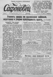 Смерть немецким оккупантам! № 1 2 К Р А С Н О Ф Л О Т С К А Я Г А З Е Т А Прочти и передай товарищу. Понедельник 1 м а р т а 1943 г. ЛЕТЧИКАМ - ГВАРДЕЙЦАМ Отважным сталинснм соколам -латникам, командирам, политработникамшлем горячий привет от комсомольцев, советской молодежи и сердечноепоздравление с дем 25-ой годовщи­ ны КраснойАрми. Желаем вам, дорогиедрузья, и впредь беспощадна громить врага в воздухе, на земле и на море. Да здравствуютсоветские летчики! Да здравствует товарищ Сталин! Секретарь ЦК ВЛКСМ Н. МИХАЙЛОВ. Усилить удары по в р а в ш и войскам, неустанно и упорно преследовать врага ★ ★ ★ ■ва ★ ★ ★ И. СТАЛИН. ВОЕВАТЬ, КАК ВЕЛИТ ТОВАРИЩ СТАЛИН! В сердца летчиков -истре- би т ел ей надолго запали про грамные слова сталин­ ского приказа : «Во имя освобождения нашей родины от ненавист­ ного врага, во имя оконча­ тельной победы над не- м ѳ ц к о - фашистскими зах ­ ватчиками , - ПРИКАЗЫВАЮ: 1. Неустанно совершен ­ ствовать боевую выучку и укреплять дисциплину, по­ рядок и организованность во всей Красной Армии и в Военно-Морском Флоте . 2. Усилить удары по в р аж е с к им войскам , неус ­ танно и упорно преследо­ вать врага, не д ава ть ему закрепляться на оборони­ тельных р у б еж а х , не д а ­ вать ему отдыха ни днем , ни ночью, ре з а ть комму ­ никации врага, о к р уж а ть в р аж е с к и е войска и унич­ т о ж а т ь их, если они о т к а ­ зываются с л о ж и т ^ ору­ ж и е » . С предельной четкостью и ясностью перед к аждым воином великий Сталин пос т вил з адачу . И выслушав исторический при ка з , истре­ битель Пилипенко заявил: „Ра з товарищ Сталин с к а ­ зал, т а к и будет. Мы уси ­ лим свою боевую работу.» Это было шесть дней тому на­ зад. Сегодня ле т чи ки -и с т ре ­ бители боевыми делами во славу родины отвечают на при ка з Верховного Глав ­ но командующе го . 25-го февраля сталинский сокол Пилипенко в воздухе в с т р е ч а е т с я с «Мессер- шми т т ами» и своим мощным ударомповергае т е гона земь . 26 го февраля Герой Совет­ ского Союза Петр Сгибнев нагоняет «Мессершмитта» и стремительным у д а р о м уничтожил его. Т а к от­ вечают на приказ вождя героические летчи ки -ис тре - бители. Та к поступать дол­ ж е н к аждый истребитель. За два дня сбито два стервятника. Это большое дело. Эти фрицы больше никогда не появятся над нашей землей . Но може т ли это быть пределом? Нет! Наши удары по врагу с к аждым днем должны все увеличиваться и увеличи­ ваться. Накануне великого празд­ ника летчик Дорошин сбил «Ю -88 “, гвардеец Хрусталь сразил «Ме-110». Этот слав­ ный счет продлили Сгибнев и Пилипенко. Этот сче т воз­ мездия должен продолжать каждый истребитель. Так тр ебуе т товарищ Сталині Во всей нашей работе нужно решительно бороться против благодушия, беспеч­ ности и з а знайства . Битва с немецкими захватчиками еще не окончена, она толь­ ко развертывается и раз го ­ рается. Летчик-истребитель , выше боевое напряжение! Механики , оружейни ки — все силы, все умение и мас­ терство на подготовку ма­ териальной части! Этого требуе т товарищ Сталин. Приказ товарища Сталина— наша боевая программа. Он веде т нас к новым победам. И наш ответ вождю: — Есть, усилить удары по в р аже с ким войскам! , Гвардии капитану т. Сгибневу Поздравляю Вас, тов. Сгибнев, с шестнадца­ той блестящей победой. Шестнадцать фашист ­ ских стервятников нашли себе могилу от ва ­ шего меткого выстрела в сочетании с искус­ ным манев