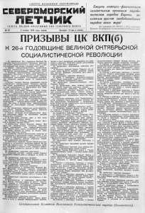 СМЕРТЬ ЛШІ .ЕЦІОІМ ОККУПАНТАМ! СЕВЕРОМОРСКИЙ ЛЁТЧИК Г А З Е Т А В О Е Н Н О - В О З Д У Ш Н Ы Х СИЛ С Е В Е Р Н О Г О Ф Л О Т А № 25 3 ноября 1943 года, среда. Выходит 12 раз в месяц. Смерть немецко - фашистским захватчикам, кровавым порабо тителям народов Европы, за клятым врагам свободолюбивых народов всего мира! (Из призывов ЦК ВКП(б) к 26-й годовщине Великой Октябрьской Социалистической Революции). ПРИЗЫВЫ ЦК ВКП(б) К 26-й Г О Д О ВЩ И Н Е В ЕЛ И Н О Й О К Т Я Б Р Ь С К О Й СО Ц И А Л И С ТИ Ч ЕС КО Й Р Е ВО ЛЮ Ц И И 1. Да здравствует 26-я годовщина Великой Ок тябрьской Социалистической Революции, свер гнув шей власть империалистов в нашей стране и про возгласившей мир между народами всего мира! 2. Смерть немецко-фашистским захватчикам, кровавым поработителям народов Европы, з а к л я тым врагам свободолюбивых народов всего мира! 3. Товарищи красноармейцы, краснофлотцы и командиры, партизань: и пар ти зан ки ! Защищайте свободу, честь и независимость нашей Родины! Беспощадно унич тожай те ги тлеров с ки х разбойни ков, очищайте родную землю от ненавистного врага! 4. Привет народам Европы, борющимся против гитлеровского империализма! Патриоты европей ских стран, поднимайтесь на вооруженную борьбу за свое освобождение от фашистского ига! Свер гайте ги тлеров с кую тиранию ! 5. Братья угне тенные славяне! Шире ра зд у вайте пламя народной войны против немцев-угне- тателей — смертельных врагов славянства. Да здравствует вооруженная борьба славянских народов против ги тлеров с ки х Империалистов! 6. Да здравствует победа англо-советско-амери канского боевого союза над злейшими врагами человечества — немецко-фашистскими поработите лями. Все силы и боевую мощь свободолюбивых народов на быстрейший разгром гитлеровской Г ермании! 7. Да здравс твую т доблестные англо-американ ские войска, ведущие борьбу против немецких фашистов на терри тории Италии! 8. Привет летчикам англо-американской авиа ции, наносящим удары по жи зненным центрам фашистской Германии! 9. За сове тскую отчи зн у ид у т в бой сыны всех народов Советского Союза. Да здравствует Красная А р м и я—армия брат ства и дружбы народов СССР! 10. Доблестные воины Красной Армии! Вас ждут,^ ка к освободителей, миллионы советских людей, и зны вающи х под немецко-фашистским игом. Крепче бейте врага, истребляйте немецких захватчиков. Вперед на запад, за полное осво бождение советской земли! 11. Отомстим немецко-фашистским извергам за разграбление и разрушение наших городов и сел, за насилия над ж енщинами и детьми, за убийство и увод в немецкое рабство советских людей. Смерть немецким мерзавцам! 12. Пехотинцы Красной Армии ! Неотступно пре следуйте и истребляйте вражеские войска. Не да вайте им за крепля ться на оборонительных рубе жах! Окружай те и берите в плен немецких захват- чинов, а если о т к а ж у т с я сдаться в плен, уни ч то жайте их! Да здравствуют советские пехотинцы! 13. Советские летчики — соколы нашей Родины! Ьеспощадно громите врага в воздухе, на земле, на море! Да здравствуют советские ле тчи ки ! 14. Та н к и с ты Красной А рмии ! Кр уш и т е и неот ступно преследуйте врага! Смелым маневром отре зайте п у ти отхода пр о ти в н и к у , беспощадно у н и ч тожайте немецких захватчиков ! Да здравствуют советские танкисты! і ‘ £ ртиллеРис ты и минометчики Красной А р мии. Мощными огневыми ударами сокрушайте Укрепления, у злы и опорные п у