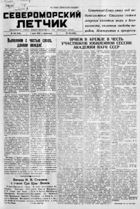 'VVt jjClbS-fi ЗА НАШУ СОВЕТСКУЮ РОДИНУ! СЕВЕРОМОРСКИМ ЛЕТЧИК ЕЖЕДНЕВНАЯ ГАЗЕТА ВОЕННО -ВОЗДУШНЫХ СИЛ СЕВЕРНОГО ФЛОТА № 155 (5 3 5 ). 1 июля 1945 г., воскресенье N° 155 (5 35 ). Советский Союз стал под во­ дительством Сталина самым могучим оплотом мира и безо­ пасности, оплотом свободы на­ родов, демократии и прогресса. Выполним с честью слово, данное вождю! Весь советским народ востор­ женно встретил известие о при­ своении Верховному Главно- командующему всеми вооруженны­ ми силами Советского Союза товарищу Сталину звания Г ероя' Советского Союза, о награждении товарища Сталина вторым орденом «Победа» н о присвоении ему выс­ шего воинского звания — Генера­ лиссимус Советского Союза. На \ митингах в частях и подразделе­ ниях с горячими речами выступали летчики, техники, авиаспециа­ листы. Ж ел ая товарищу Сталину долгих лет жизни и здоровья, они I говорили о чувстве безграничной благодарности любимому вождю и полководцу, который спас совет­ ский народ и свободолюбивые на­ роды мира от угрозы фашистского рабства. Североморские авиаторы, как и все советские люди в эти ра­ достные дни, с гордостью огляды ­ вались на боевой путь, пройден­ ный за годы Отечественной войны под гениальным руководством | товарища Сталина. В ходе Великой Отечественной ! войны вооруженные силы Совет- і ского государства, благодаря м у д - ; рому руководству товарища | Сталина и постоянным его забо­ там, выросли В могучую силу, спо- : ссбную отстоять социалистические завоевания нашего народа и госу­ дарственные интересы Советского Союза. Североморские летчики зна­ ют это и по своему опыту. В их рядах за войну выросло 59 Героев Советского Союза и много десят­ ков кавалеров боевых орденов. В наших рядах — немало ветеранов Отечественной войны — замеча­ тельных сталинских воинов, нано­ сивших врагу грозные, сокруши- : тельные удары. Выполняя указа­ ния товарища Сталина, они учи­ лись в перерывах между боевыми Емлетами и в воздушных сраже­ ниях. Из каждого боя они извле­ кали опыт, становясь день ото дня все более зрелыми и умелыми вои­ нами. Все мы знаем летчика-истреби- теля т. Бурматова. Он начал вой­ ну краснофлотцем, рядовым пило­ том. Сейчас это зрелый воздушный боец, Герой Советского Союза. 13 немецких самолетов записано на его счет. Один из фашистов сбит Вурматовым с третьего выстрела! Сегодня т. Бурматов командует подразделением, обучая молодых летчиков искусству побеждать врага. Мы знаем и другого летчика- истребителя, не менее доблестно сражавшегося с врагами. Это гвар­ деец т. Диденко. Он начал вое­ вать сержантом, а сейчас — гвар­ дии капитан, Герой Советского Союза. На его счету— 17 сбитых не­ мецких самолетов. В дни войны он показал себя не только отличным чшие ит луч- вокруг кото- в дружную части и под- воздушным бойцом, ко и смелым новатором, дерзновенно раскрыва­ ющим новые возможности во вве­ ренном ему оружии. Десятки и сотни таких воинов служат в частях ВВС Северного флота. Сотни тысяч к миллионы таких воинов заботливо вырастил Генералиссимус Советского Союза товарищ Сталин в рядах вооружен­ ных сил нашего Советского госу­ дарства. Родина отметила их высо­ кими наградами — орденами и ме­ далями Советского Союза—свиде­ тельством доблести и мастерства тех, чью грудь они украшают. Много умелых и мужественных воинов выросло здесь, в Запо­ лярья. Своими подвигами, свое