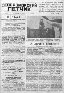 СМЕРТЬ НЕМЕЦКИМ ОККУПАНТАМ! СЕВЕРОМОРСКИЙ ЛЕТЧИК ЕЖЕДНЕВНАЯ ГАЗЕТА ВОЕННО-ВОЗДУШНЫХ СИЛ СЕВЕРНОГО ФЛОТА № 51 (431) 1 марта 1945 года,.кчетверг № 51 (431) ...//а четвертом году войны Красная Арлит стала крепче а сильнее , чем когда бы то ни было, ее боевая техника стала еще более совершенной, а боевое мастерство—во много раз выше . Я . СТАЛИН . П Р И К А З Верховного Главнокомандующего Командующему войсками 2-го Белорусского фронта Маршалу Советского Союза РОКОССОВСКОМУ Начальнику штаба фронта Генерал-полковнику БОГОЛЮБОВУ Войска 2-го Белорусского фронта, продолжая наступление, сегодня, 28 февраля, овладели городами Нсйштеттик и Прех- яау— важными узлами коммуникаций и сильными опорными пунктами обороны немцев в Померании. В боях за овладение городами Нойштеттин и Прехлау от личились войска генерал-полковника Попова, генерал-лейтенан та Логунова, генерал-лейтенанта Дратвина, генерал-лейтенанта Микульского; кавалеристы генерал-лейтенанта Осликовского, генерал-майора Чудесова, генерал-майора Чепуркина, генерал- майора Брикель, генерал-майора Калюжного, полковника Ар темьева; артиллеристы генерал-майора артиллерии Нефедова, полковника Лебедева, полковника Рыбкина,' полковника Соли- тана, подполковника Андрианова, подполковника Новтаннша, подполковника Плаутина, майора Баранова, майора Незсмайко, майора Золотайко; танкисты подполковника Гайдаенко, майора Багрянова, майора Артюшина, майора Неверова, майора Моска ленко; летчики генерал-полковника авиации Вершинина, пол ковника Грищенко, полковника Рыбакова, полковника Виногра дова, полковника Тюрина, подполковника Козаченко; саперы подполковника Золотарева, майора Старовойта; связисты под полковника Курбатова, подполковника Рачибо, подполковника Бурд, подполковника Елисеева, майора Антошина. В ознаменование одержанной победы соединения и части, наиболее отличившиеся в боях за овладение городами Нойштет тин и Прехлау, представить к награждению орденами. Сегодня, 28 февраля, в 21 час столица нашей Родины Москва, от имени Родины салютует доблестным войскам 2-го Бе лорусского фронта, овладевшим названными городами,— двенад цатью артиллерийскими залпами из ста двадцати четырех орудий. За отличные боевые действия об’являю благодарность ру ководимым Вами войскам, участвовавшим в боях за овладение городами Нойштеттин* и Прехлау. Вечная слава героям, павшим в боях за свободу и незави симость нашей Родины! Смерть немецким захватчикам! Верховный Главнокомандующий Маршал Советского Союза И. СТАЛИН . 28 февраля 1945 года. Xs 286. .— 0 ----- В С О В Н А Р К О М Е С С С Р Об увековечении памяти писателя Алексея Николаевича Толстого Совет Народных Комиссаров Союза ССР постановил: і- Соорудить а г. Москве памят ник писателю Алексею Николае вичу Толстому. 2. Установить мемориальную до. скудна доме № 2 по Спиридоньев ской улице в городе Москве, где жил А. Н. Толстой. 3. 'Переименовать! Спиридоньев скую улицу в городе Москве в улицу Алексея Толстого. 4. 'Поручить Огиву РСФСР из дать в течение 1945—1946 годов полное собрание сочинений А. Н. Толстого. 5. Установить следующие сти пендии имени А. Н. Толстого: а) в Московском государствен ном университете иімени М. В. Ло моносова?—2 стипендии по 400 рублей каждая для студентов фи лологического факультета; б) в литературном институте Союза Советских писателей СССР—2 стипендии по 400 