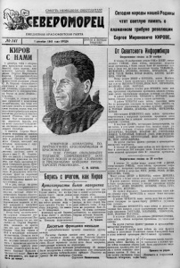 СМЕРТЬ НЕМЕЦКИМ ОККУПАНТАМ! шшшт ЕЖЕДНЕВНАЯ КРАСНОФЛОТСКАЯ ГАЗЕТА № 141 1 д е кабря 1943 года СРЕДА ПРОЧТИ И ПЕРЕДАЙ ТОВАРИЩУ Сегодня народы нашей Родины чтят светлую память о пламенном трибуне революции Сергее Мироновиче КИРОВЕ . КИРОВ С НАМИ 1 декабря 1934 г. оборва­ лась прекрасная жизнь лю ­ бим о го сына партии, пла­ м е нно го трибуна больш е ­ визма Сер ге я Мироновича Кирова . Т р о ц к и с т с к о -б у х а ­ ринские бандиты, агенты фаши с тской разведки убили С. М . К и р о в а— ближ айш е го соратника и дру га товари ­ ща Сталина , страстного не ­ с гибаемо го и непримиримо ­ го борца за дело Ленина — Сталина . Се годня , в годину с у р о ­ вых сражений с немецкими захватчиками , мы чтим его све тлую память и склоняем свои головы перед т ем ,к т о всю свою героическую жизнь посвятил рассвету и счастью нашей Родины , кто всю жизнь был непримирим к ее заклятым врагам, кто со всей страстью большеви­ ка отстаивал завоевания ве­ ли ко го Октября . С именем Сергея М и р о ­ новича неразрывно связана огромная работа по освое­ нию и развитию того Край­ него Севера, который мы сегодня защищаем с ор у ­ жием в руках . Нам , североморцам, как ...никому д р у гом у , свято и доро го имя С. М. Кирова. Э то он вместе с товарищем Сталиным приезжал на Се ­ вер, где была заложена ос­ нова Северного флота. М н о ­ го сил и энергии отдал С ер ­ гей Миронович его разви­ тию. В результате чего С е ­ верный флот за короткий срок превратился в мо гучую боевую единицу наших во­ ор уж ен ны х сил. И в дни, когда на долю воинов североморцев выпала великая освободительная миссия, светлый образ не­ забвенного Кирова сопутст­ вует нам в походах и сраже­ ниях, вдохновляет нас на героические подвиги и ве­ дет уверенно к грядущей победе над подлыми ордами фашистских разбойников. Н е си боец, на своем шты ­ ке суровое отмщение гит­ леровским головорезам! Лю ­ би свою Родину так же, как любил ее Сергей Мироно­ вич, ненавидь ее врагов так же, как ненавидел их ' Киров. Иди без страха в бой и истребляй немецких захватчиков. Отомсти им за гибель великого граждани­ на, ж г уч и м свинцом распла тись с проклятым врагом за пламенного трибуна рево­ люции, отомсти врагу за на­ ш е го Кирова! Выполни с честью его наказ: „Врага ма­ ло р а з громи ть , ого надо до ­ вить до конца". „ТОВАРИЩИ - КОМАНДИРЫ, ПО­ ЛИТРАБОТНИКИ, КРАСНОАРМЕЙЦЫ И КРАСНОФЛОТЦЫ! ... ЕЩЕ ГЛУБЖЕ ОВЛАДЕВАЙТЕ ТЕХНИКОЙ СОВРЕМЕННОГО БОЯ! БУДЬТЕ ВСЮДУ И ВЕЗДЕ СТОЙКИМИ И ПРЕДАННЫМИ БОЙЦАМИ ПРОЛЕ­ ТАРСКОЙ РЕВОЛЮЦИИ... С. М. КИРОВ. Борись с впагоиі, как Киров -о- Артиллеристы бьют наверняка Командир взвода лейтенант Утукин заметил, что на вра­ жеском берегу залива .немцы собирают дрова. — Ах, вы озябли. Ну мы вам сейчас нагоним жару — шутя произнес Утукин и со­ общил дежурному, что замече­ но 13 гитлеровцев. Командиры орудий Баранов и Кузин вместе с расчетами, быстро подготовились к стрель­ бе. Командир подразделения подготовил необходимые дан­ ные и одному из расчетов при­ казал открыть огонь. Не прошло и нескольких секунд, как раздался первый выстрел, за ним— второй. Сна­ ряды ложились точно. С пер­ выми же разрыва ии было от­ мечено, что немцы поспешили разбежаться, но смертоносные снаряды догоняли бандитов. Старший сержант А. Гришин. Десятью фрицами меньше С наблюдательного пункта заметили группу немцев. Расчеты быстро заняли свои места у ору­ дийі и открыли ог