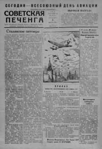 С Е Г О Д Н Я — В С Е С О Ю З Н Ы Й Д Е Н Ь А В И А Ц И И Пролетарии всех стран, соединяйтесь! г о д СОВЕТСКЯЯ ПЕЧЕНГЛ Орган Печенгского Райкома ВКП(б) и Районного Совета депутатов трудящихся Мурманской области. ИЗДАНИЯ 1-й № 59 (7-1) Воскресенье А К Г У С Т Л I - “I-- L l P i i a ‘- (I к о ч . ВЫСОКАЯ НАГРАДА За Б®сстановление разрушенного немецкими фаши стами комбината ,,Печенганикель“ , успешное осюение производства и наращивание производственных мощно стей по выпуску никелевого файнштейна Президиум Верховного Совета СССР наградил 2 а Е г у с т а орденами и медалями Созетс.сого Союз я большую группу мегал- лургов, горнякоз и строителэй нашего комбината. Указ Президиума Взрхозного Созета СССР будэг опубликован в слэдующем номере нашей газэть1. Сталинские питомцы Сегодня go детская страна отмечает ставший уже тра диционным праздником Все союзный День авиации. Советский народ горячо любит гордых сталинских соколов, названных так по тому, что воздушные силы с.раны Сонетов созданы и в ы н е с т о в а н ы великим Сталиным, величайшим в истории полководцем. Выполняя стал и и с в и е планы, наша авиация с пер вых же дней войны беспо щадно истребляла -фашист ских захватчиков в воздухе и на .земле, на воде и под водой. Решающую роль п битвах .за Советский Север сыграла наша авиация. Авиационная подготовка северного театра войны против СССР нача лась сразу же после оккупи- рования Германией Норве гии. Численность самолетно го парка противника со 100 бомбардировщиков, и 50 ист ребителей к началу воины возросла до 400—450 еди ниц. Летный состав немцев помимо боевого опыта, по лученного в войне с Поль шей, Францией и Англией, прошел специальную подго товку с учетом особенностей . дверного театра. ! Рдсчеты немцев были по строены на внезапности на падения . Фашисты ударами с воздуха надеялись парали зовать работу Мурманско го порта и Кировской же лезной дороги, поддержать своих егерей—„героев Кри та и Нарвика", рвавших ся к Мурманску. Расчеты врага были сорва ны нашими мужественными летчиками. Зорко несли они боевую вахту в голубом не бе. Не помогло немцам и превосходство, имевшееся первое время в материальной части. Наши бесстрашные истребители сбросили с со ветского неба на землю про славленных фашистских ас- сов—капитана Шашке, капи тана Лоевского, Мюллера и других. В неравных порою схватках с врагом летчики Севера отвалено выполняли свою воинскую нерушимую клятву. Крыдатые мстители, добле стные и бесстрашные истре бители Иван Бочков—пер вый асс Севера, Павел Ку- тахов, Константин Фомчеп- ков, Леонид Гальченко, Виктор Крупский, Виктор Миронов, Василий Королев,. Николай Кузнецов, Алексей Хлобыстов, штурмовик Коб- зев, разведчики и бомбарди ровщики Василий Дончук, Антон Сливка, Александр Колесников и другие, завое вавшие впоследствии высо кое звание Героя Советского Союза, в воздушных боях н на аэродромах только за два года уничтожили более 800 немецких самолетов и более 600 фашистских летчиков. Наши летчики прославили се'я в этих боях незабвен ными образцами отваги и мужества. 8 апреля 1942 го да шесть гвардейцев под командой Героя Советского Союза Полдня iceI а отразили налет 28 вражеских самоле тов, совершив три тарана в I одном бою. С подвигами истребителей перекликались ' удары наших бомбардиров щиков. Только за один вы лет пикировщики под коман дой майора Василия Котова сож