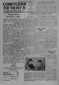 Пролетарии, всех стран, соединяйтесь! СОВЕТСКАЯ ПЕЧЕНГА Орган Печенгского Райкома ВКП(б) и Районного Совета депутатов трудящихся Мурманской области. Г О Д ИЗДАНИЯ 1-й № 68 (83) Четверг 4 СЕНТЯБРЯ 1947 г. Цена 20 коп. День Победы над Японией Вчера вся советская страна праздновала вторую годовщину со дня разгрома японских империалистов доблестной Советской Армией и союзниками. На всех предприятиях и в учреждениях Печенг ского района вчера прошла мит нги, посещенные этому историческому'событию. Труженики древней Печенги горячо приветствовали героических совет ских воинов и великого полководца Генэрэлиссимуса Советского Союза Иосифа Виссарионовича Сталина, под чьим мудрым руководством была достигнута эта славная победа. Подготовить жилища к зиме Приближается суровая за полярная зима. К ее наступ лениюследует готовиться уси ленными темпами. Особо это касается жилищ трудя щихся. В нынешнем году перед строителями комбината по ставлена очень серьезная за дача по вводу в строй ногой жилищной площади. Заня тые этим, они не в силах будут оторваться на теку щий ремонт жилья. Боль шие капитальные р а б о ты проводит нынче и ремонтно- строительная группа жи- лищно -коммунального отде ла.. Она тоже не в силах б.р&°,т охватить все дома, требующие ремонта. Следо вательно,вывод напрашивэет- ся только один: чтобы зима пе застала врасплох, нужно последовать примеру ленин градцев, чей опыт подхва чен во многих городах стра- лы, и взяться за ремонт жи лого фонда силами самих трудящихся, самих жиль цов. Дело это вполне реаль ное, вполне осуществимое, но оно требует к себе серь езного отношения со сторо ны всех,—-как хозяйствен ников, так и квартиросъем щиков. Хозяйственники—в основном дирекция комбина та — должны предоставить трудящимся необходимые материалы, а квартиросъем щики—пустить их по назна чению, с толком использо вать каждый квадратный метр леса, каждый грамм извести или краски и т. д. В заречном поселке, в не которых домах прошлогод ней постройки осела земля ная засыпка фундаментов. В квартиры стал попадать ветер. Чего, кажется, проще, оторвать доски и самому подсыпать земли, чтобы в комнате стало тепло. Дело нетрудное, не требует ника ких особых знаний и боль ших затрат. Однако многие жильцы таких домов, не имеющие чувства хозяйско го отношения к государст венному имуществу, предпо читают жить в холодных комнатах, ожидая прихода Кого-то со стороны для тако го незначительного ремонта. Таких случаев имеется еще много, когда из-за от валившейся доски, незама- занного окна, вываливше гося кирпича, — люди, на строенные иждивенчески.оби- вают пороги ремонтной группы, требуя прихода плот ника, печника и т. д. С та кими настроениями нужно бороться, разъясняя людям весь вред таких настроений. Сегодня в „Советской Пе- ченге“ печатаются короткие выступления ме т а лл у р г а т. Шурындина и кузнеца т. Рязанова Они ставят вопрос о выделении им ма териала, а ремонт произве дут своими силами. Их по чин следует подхватить всем жильцам, а хозяйст венникам—поддержать ини циативу трудящихся, выде ляя для саморемонта необ ходимый материал. Профсоюзным организаци ям, в частности обрудзавко- му, а особенно партийным организациям и, в первую очередь парткому комбина та, следует взять под свое наблюдение саморемонт жи лищ, мобилизовав на их под готовку к зиме всех трудя 