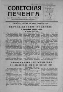 Пролетарии всех стран, соединяйтесь! СОВЕТСКАЯ ПЕЧЕНГЯ Орган Печенгского Райкома ВКП(б) и Районного Совета депутатов трудящихся Мурманской области. Г О Д " ИЗДАНИЯ 2-й № 1Q (125) Воскресенье 1 , ФЕВРАЛЯ V 18 г. Цена 10 коп. ЧЕТВЕРТАЯ СЕССИЯ ВЕРХОВНОГО СОВЕТА СССР И Н Ф О Р М А Ц И О Н Н О Е С О О Б Щ Е Н И Е о заседании совета союза 30-го января в 2 часа дня в зале заседаний Верховного Совета ’.-OP в Кремле состоялось откры тие четвертой сессии Совета Сою за. Пре^едательствующий предсе датель совета Союза депутат Пар фенов II. А. предоставляет слово председателюмандатной комиссии депута у Натоличеву Н. С. для докладао результатах проверки полномочийвновь избранных депу татовСовета Союза по 6-тиизби рательным округам, взамен выбыв ших. По предложению депутата До ронина II. И., Совет Союза прини мает следующее постановление: «Заслушав доклад мандатной комиссии, Совет Союзапостановляет: Утвердить докладмандатной комиссии о признании правильны миполномочий депутаов Совета 30 января 1948 года Союза, избранных 6-гоиюля 1947 года по избирательным округам: Дмитриевскому № 201, Сталин скому второму № 466, Климович- скому № 535; 21-го декабря 1947 г. ио избирательнымокругам: Ставропольскому№ 81, Сталинско му первому № 465 и 18 -го янва ря 1948 т. по Елгавскому изби рательному округу № 449». Председатель Совета Союза де путат Парфенов И. А. сообщает, что на рассмотрение сессии вно сятся следующие вопросы: I. Утверждение государствен ного бюджета СССР на 1948 годи отчета об исполнениигосударствен ного бюджета СССР за 1946 год. Вопрос вносится СоветомМи нистров СССР. 2. Утверждение Указов Прези диума Верховного Совета СССР. Вопрос вносится Президиумом Ве р х о в н о г о Совета СССР. СоветСоюза по предложению депутата Козлова В. И. единоглас но включает эти вопросы в поря док дня сессии. СоветСоюза по предложению депутата Фирюбина Н. П. прини мает следующийпорядок рассмот рения вопросов: докладо государственномбюд жетеСССР на 1948 год и об ис полнении государственного бюдже та СССР за 1946 год заслушать на совместном заседании Совета Национальностей и Совета Союза, а содоклады бюджетных комисий, обсуждение бюджета и его утвер ждение провести раздельно по па латам; утверждениеУказов Прези диума Верховного Совета СССР провести раздельно по палатам. На этомпервое заседание Со вета Союза закрывается. И Н Ф О Р М А Ц И О Н Н О Е С О О БЩЕ Н И Е о з а с е д а н и и с о в е т а н а ц и о н а л ь н о с т е й 30-го января в 4 часа дпя в зале заседанийВерховного Совета СССР в Кремле состоялось откры тие четвертой сессии Совета На циональностей. Председательствующий предсе датель Совета Национальностей де путат Кузнецов В.В. сообщает, что на рассмотрение сессии вно сятся следующие вопросы: I. Утверждение государствен ного бюджетаСССР на 1948 годи отчет об исполнении государст венного бюджета СССР за 1946 год. 30 января 1948 года Вопрос вносится Советом Ми нистров СССР. 2. Утверждение Указов Прези диума Верховного Совета СССР. Вопрос вносится Президиумом Верховного Совета СССР. Совет Пациональностейпо предложениюдепутата Шаяхмето- ва Ж. единогласно включает эти вопросы в порядок дня сессии. Совет Национальностей по предложению депутата Лазути на П. Г. принимает следующий порядок рассмотрения вопросов: доклад о государственном бюд жете СССР на 1948 год и об ис полнениигосударственного бюдже та СССР за 1946 год заслушать на с