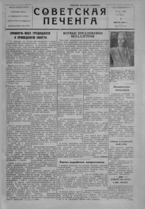 ОРГАН ПЕЧЕНГСКОГО РАЙКОМА ВКП(б) И РАЙ ОННО ГО СОВЕТА ДЕПУТАТОВ ТРУДЯЩИХСЯ МУРМАНСКОЙ ОБЛАСТИ ПРОЛЕТАРИИ ВСЕХ СТРАН, СОЕДИНЯЙТЕСЬ! ВЕТСКАЯ ПЕЧЕНГЯ ГОД ИЗДАНИЯ 2-й № 21 (136) ^ Ч Е Т В Е Р Г 4 МАРТА 1948 г. Цена 20 копеек ПРИВЛЕЧЬ ВСЕХ ТРУДЯЩИХСЯ К ПРОВЕДЕНИЮ САШ1РА С 15 февраля на всех предприятиям цветной метал лургии наше!: страны начал ся общественный смотр ис пользования рационализатор ских предложений, использо вания оборудования и рас становки рабочей силы. Он проводится по решению Ми нистерства и центрального комитета профсоюза рабочих цветной металлургии. Проводимый смотр должен сыграть большую роль в по вышении производительности труда, эффективном исполь- завании оборудования, а, следовательно, и п досроч ном выполнении социалист веских обязательств по за вершению пятилетнего плана в четыре года. - ' Большие задачи в связи с этим стоят и перед кол лективом трудящихся ком- Пината „Печенганикель",— перед горняками, металлур гами, строителями, электри ками и работниками других специальностей. Акт и иное участие в проведении смотра поможет каждому тружени ку глубже вникнуть в ра/ю ту своего цеха, участка, за метить существующие недо статки, быстрее исправить их и добиться общего но вы ш е н и я производитель ности труда, досрочного за- нершени I взятых: на себя социалистических обязатель ств. • \Ото го и должны добивать ся с первых же дней смот ра руководители цехов, пар тийные, комсомольские и профсоюзные организации. Нельзя допускать такого по ложения, как в прошлом го- д у, когда на „раскачку" утл о больше половины все го смотра. Да и нельзя сказать, чтобы в прошло- 1 однем смо.тре широко уча ствовал весь коллектив пред приятия. В этом была до пущена серьезная ошибка как со стороны партийной, так и профсоюзной органи заций комбината, самоуст ранившихся от смотра. Сейчас в ряде цехов на чинает развертываться ра бота по проведению смотра. В металлургическом цехе уже зарегистрированы пред ложения отдельных рацио нализаторов - производствен ников и инженерно-техниче ских работников. Имеются предложения в УКС“е, на руднике и других пред приятиях. Но это лишь пер вые шаги. Работа предсто ит большая и серьезная и с ней нельзя медлить неде лями. Надо активнее прив лекать к TFopnecKofl работе| кажд )го I роизводственнн -! ка, инженера и техника, ма-; стера и бригадира, будиль; в них инициативу и пытли- ность, поднимать на борь бу з а . досрочное. выполне ние плана послевоенной ста линской пятилетки. Не следует также забы вать и о том, что не толь ко рационализаторские пред ложения будут содейство вать успешной производст венной деятельности каждо го предприятия, цеха и уча стка. Большое значение приобретает здесь и пра вильное использование обо рудования. А с этим де лом не все обстоит -благо получно на комбинате. Не достаточно используется станочный парк в ремонтно механическом цехе. Совер шенно слабо применяется механизация у строителей, где и рабочая сила зачастую используется неудовлетво рительно. Есть над чем поработать автотранспортникам и авто ремонтникам комбината. Ав тотранспорт, несмотря на его большие простои из-за бездорожья, попрежнему вы ходит на линию без доста точной подготовки. Боль шие недочеты по организа ции труда имеет авторе монтная мастерская. Однако руководители це ха—тт.. Костецкий и Усти нов—несерьезно, как и в прошлом году,