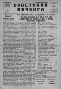 О Р Г А Н П Е Ч Е Н Г С К О ГО Р А Й К О М А ВКП (б ) И Р А Й О Н Н О ГО С О В Е Т А Д ЕП У Т А ТО В Т Р У Д ЯЩ И Х С Я М У РМ АН С КО Й О БЛАСТИ ПРОЛЕТАРИИ ВСЕХ СТРАН, СОЕДИНЯЙТЕСЬ) СОВЕТСКАЯ Год нэда ния 8-й ПЕЧЕНГА № 18 ( 216 ) ЧЕТВЕРГ 3 М А Р Т А 1949 года Цена 20 копеек Проявление заботы о советских людях С чувством полного удов­ летворения и большой ра­ дости встретили трудящие­ ся района постановление Со­ вета Министров СССР и ЦК ВКП(б) с новом снижении государственных розничных цен «а товары массового пот­ ребления. Они видят в этом постановлении проявление любви и большой заботы партии и правительства к советским людям. Утром и вечером 1-го марта на предприятиях и в учреждениях прошли много­ людные собранья и митинги. Рабочие и служащие в сво­ их выступлениях выразили единодушное одобрение по поводу проводимых мероп­ риятий Центральным Ко­ митетом большевистской партии и Советским прави­ тельством. Благодарность и спасибо великому Сталину выразили они за великую заботу о людях нашей необ- ятной советской Родины. — Непомерный под‘ем на­ родного хозяйства в социа­ листической стране обеспечен советским народом под руко­ водством большевистской партии, советского прави тельства и мудрой политики вождя народов любимого Сталина. «Вот почему все на­ ши рзори сейчас обращены к тому, кто сумел привести народ к величайшим завое­ ваниям. Вот почему мы кля немея любимому Сталину множить свои производст­ венные успехи",—так i овори- ли трудящиеся на митингах, посвященных постановлению партии и правительства. — Снижение цен приво­ дит к значительному росту реальной заработной платы. В этом мы можем убедить­ ся. По сравнению с прош­ лым я сейчас ежедневно бу­ ду экономить 15 рублей, следовательно в месяц—450 рублей, которые раньше тратились на продукты, сей­ час эти деньги пойдут на культурные запросы моей семьи,—сказал тов. Зуев. Второй этап снижения цен является ярким свидетель­ ством последовательного проведения в жизнь задач, намеченных коммунистиче­ ской партией и Советским правительством. Он сыграет огром&ое!-значение в п овы- шении материального и ку­ льтурного уровня населения. Трудящиеся района понима­ ют, что движение вперед и борьба за новые достижения —это задача каждого со­ ветского человека. Вот по­ чему металлурги и горняки, строители в ремонтникн — все коллективы рабочих и служащих района в ответ на постановление партии и правительства берут на се­ бя новые повышенные социа­ листические обязательства, ПОСТАНОВЛЕНИЕ СОВЕТА МИНИСТРОВ СССР И ЦК ВКП(б) ' “ о О новом снижении с 1 марта 1949 года государственных розничных цен на товары массового потребления 1. При проведении в кон­ це 1947 года денежной ре­ формы и отмены карточной системы были отменены вы­ сокие цены коммерческой торговли и введены единые спижен н ьте государственные розничные цены на товары массового потребления. Это был первый этап снижения цен на товары массового потребления. Снижение цен па первом этапе привело к удешевлению товаров мас­ сового потребления по линии государственной розничной торговли в течение года по меньшей мере на 57 мил лиардов рублей. Эта сумма представляла чистый убы­ ток для государственного бюджета, который нужно было покрыть и действитель­ но был покрыт в последствии Правительством благодаря росту производительности труда, .подъему производ­ 