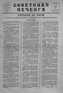 ОРГАН ПЕЧЕНГСКОГО РАЙКОМА ВКП(б) И РАЙОННОГО СОВЕТА ДЕПУТАТОВ ТРУДЯЩИХСЯ МУРМАНСКОЙ ОБЛАСТИ ПРОЛЕТАРИИ ВСЕХ СТРАН, СОЕДИНЯЙТЕСЬ! Год изда нйя 3-й № 88 ( 286 ) ЧЕТВЕРГ 3 НОЯБРЯ 1949 года Иена 20 копеек ПР ИЗЫВЫ ЦК ВКП( б ) к 32-ой годовщине Великой ОкшябрЬской социалистической 1. Да здравствует 32 годовщина Ве­ ликой Октябрьской социалистической ре­ волюции! 2. Братский привет всем народам, бо­ рющимся за победу демократии и соци­ ализма! 3. Братский привет народам Польши, Чехословакии, Болгарии, Румынии, Венг­ рии, Албании, вступившим на путь стро­ ительства социализма! 4. Братский привет великому китай­ скому народу, завоевавшему свободу и независимость своей страны и создавше­ му государство народной демократии! Да здравствует Народная республика Китая! 5. Пусть живет и здравствует еди­ ная, независимая, демократическая, миро­ любивая Германия! 6. Да здравствует единая Народно- демократическая республика Кореи! 7. Трудящиеся всех стран! Защита мира —дело всех народов мира! Разобла­ чайте агрессивные планы поджигателей новой войны! Объединяйте все силы на борьбу за прочный мир и безопасность народов! Привет всем борцам за дело мира, против поджигателей новой войны! 8. Да здравствует дружба народов Англии, Соединенных Штатов Америки и Советского. Союза в их борьбе за мир, против поджигателей новой войны! 9. Слава Вооруженным Силам Со­ ветского Союза, с честью отстоявшим свободу и независимость нашей Родины! Воины Советской Армии!Бдительно охраняйте завоеванный мир и созидатель­ ный труд нашего народа! 10. Да здравствуют советские пог­ раничники—зоркие часовые священных рубежей нашей Родины! 11. Слава Героям Советского Союза и Героям Социалистического Труда— лучшим сынам и дочерям нашей Родины!' 12. Рабочие, крестьяне и интелли­ генция Советского Союза! Шире развер­ тывайте социалистическое соревнование за досрочное выполнение послевоенной пятилетки! 13. Трудящиеся Советского Союза! Боритесь за дальнейший технический прогресс в промышленности, на транспор­ те, в сельском хозяйстве! Внедряйте но­ вую технику, совершенствуйте техноло­ гию производства! Непрестанно повышай­ те производительность труда—основу дальнейшего снижения цен на товары массового потребления! 14. Рабочие и работницы, инженеры и техники! Неустанно улучшайте качест­ во продукции! Выпускайте больше вы­ сококачественной продукции! 15. Трудящиеся Советского Союза! Боритесь за строжайшую экономию и сверхплановые накопления во всех от­ раслях народного хозяйства! Улучшайте использование оборотных средств, сни­ жайте себестоимость продукции! 16. Рабочие и работницы, инженеры и техники! Добивайтесь лучшего исполь­ зования оборудования! Экономьте мате­ риалы, топливо и электроэнергию! 17. Рабочие и работницы, инженеры и техники угольной промышленности! Боритесь за полную механизацию всех процессов добычи угля! Быстрее восста­ навливайте п стройте новые шахты! Да ­ дим больше угля для народного хозяй' ства страны! революции 18. Рабочие и работницы, инженеры и техники нефтяной промышленности! Выше темпы добычи и переработки неф­ ти! Быстрее бурите скважины и осваивай­ те новые нефтяные месторождения! Боль­ ше нефти и нефтепродуктов для социа­ листического хозяйства! 19. Рабочие и работницы, инженеры и техники металлургической промышлен- ' ности! Обеспечим новый подъем произ­ 