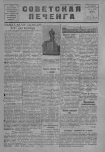 О Р ГА Н П Е Ч Е Н ГС К О ГО Р А Й К О М А ВКП (б) И Р А Й О Н Н О Г О С О В Е Т А Д Е П У ТА ТО В Т РУ Д ЯЩ И Х С Я М У РМ АНСКОЙ О БЛ А С ТИ ПРОЛЕТАРИИ ВСЕХ СТРАН, СОЕДИНЯЙТЕСЬ! С О В Е Т С К А Я - ПЕЧЁН ГА Год издаллл 3-й № 70 ( 268 ) ЧЕТВЕРГ 1 СЕНТЯБРЯ 1949 года Цена 20 копеек НАЧАЛ ДЕЛО—ДОВЕДИ ЕГО ДО КОНЦА В борьбе за досрочное вы полнение пятплетнего плана наша молодежь идет в пер вых рядах соревнующихся. Можно привести немало при меров, когда молодые рабо чие выступают зачинателями соревнования. За овладение знаниями, за высокую куль туру на производстве и по вышение производительно сти труда, за проведение ре яшма экономии и снижрние себестоимости продукции молодежь борется, проявляя творческую инициативу и активность. Подхватив призыв пере довиков производства, ком сомольско-молодежная брига да станочников во главе с бригадиром тов. Фроловым, дружно повела работу за -чдуквтворение в жизнь при нятых обязательств. В ре зультате комсомольско-мо лодежный коллектив выпол нил свое годовое задание до срочно к 1 августа. Десятки молодых рабочих ремонтно-механической ма стерской, автотранспорта н ряда других производствен ных участков, выполняя нор му на 1'50—200 процентов, также/ досрочно завершили годовой план и выполнили с$аи повышенные обязатель ства. Дал слово—сдержи его. Выполнение этого святого правила воспитывает в моло дых рабочих драгоценное чувство ответственности за каждое начатое дело, за обя зательное доведение его до кэнца. Только выполнив за дание, как бы оно трудно ни сожалению таких фактов у нас очень много. Комсомольцы жилищно- коммунального отдела проя вили хорошую инициативу, взяв на себя обязательство отремонтировать постамент памятника Пушкина. Но столкнувшись с первым пре пятствием и не встретив под держки со стороны хозяй ственных руководителей и комсомольской организации, они не довели до конца на чатое дело. Секретарь ком сомольской организации тов. Емельянова и палец о палец не ударила, чтобы помочь молодежи претворить в жизнь свои обязательства. Так, важное дело и инициа тиву молодежи горе-руково дители губят в самом его начале. В прошлом году многие комсомольцы начали учить ся в школе рабочей молоде жи. Но прошел месяц— два количество учащихся умень шалось. Из 6 класса пере стали учиться А. Костин. 11. Лохичев, В. Серова, из 7 класса бросили учебу И. Васендин, К. Климова, А. Волкова. Эти товарищи, несмотря на та, лто некстс- торые затратили много тру да, не довели начатое дело до конца. А секретари ком сомольских организаций оставили этот вопрос без внимания, успокоились на том, что д е л о у ч е б ы комсомольцев пошло са мотеком. В результате к концу года число учащихся в школе рабочей молодежи сократилось на половину Новый памятник великому русскому писателю Н. В Го голю, установленный в Мос ковском Центральном парке культуры и отдыха им. Горь кого. Начален учебный год в школах Первый хлеб— государству Вся страна с большой ра достью встретила рапорты товарищу Сталину о до срочном выполнении госу дарственных хлебозаготовок хлеборобами Стаьропольско- го, Краснодарского, При морского краев, Дагестана, Северо-Осетинской АССР, Кабардинской АССР, Тад жикской ССР. Выполнили свой долг перед Родиной также хлеборобы Гомель ской, Закарпатской, Черно вицкой, Крымской и ряда других областей. Число не- 1949 год войдет в историю народного образов