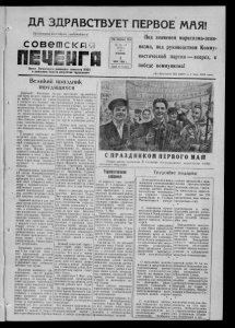 ДЛ ЗДРАВСТВУЕТ ПЕРВОЕ МАЯ! Пролетарии всех стран, соединяйтесь! советски Орган Печенгекего районного комитета КПСС и районного Оозэта депутатов трудящихся Великий праздник трудящихся Гад издания 10-й № 52, 53 (1027) ВТОРНИК 1 МАЯ Под знаменем марксизма-лени низма, под руководством Комму нистической партии— вперед, к победе коммунизма! (И з П р и зы в о в Ц К E IIC C и 1 М т , 1956 года). < Первомай!.. Миллионы лю дей труда во всех странах ми ра выйдут сегодня па улицы и площади под боевыми зна менами пролетарского интер национализма. Но всей необъят ной стране Советов вновь бу дет продемонстрировано несо крушимое морально-политиче ское единство советского на рода, самоотверженно борюще гося за великое дело построе ния коммунистического обще ства. В расцвете творческих сил встречает наша Родина этот день международной пролетар ской солидарности трудящих ся, день братства рабочих всех стран. Широко развер нувшееся социалистическое со ревнование в честь 1 Мая по всюду в городе и деревне вы звало новую волну огромного трудового и политического подъема. Воодушевленные решениями XX съезда Коммунистической партии Советского Союза и претворяя их в жизнь, совет ские люди добиваются выпол нения и перевыполнения хо зяйственных планов и, следуя давней замечательной тради ции, достойно встречают вели кий праздник трудящихся. Первомай является для нас днем смотра успехов в хозяйст венном й культурном строитель стве, в дальнейшем укрепле нии могущества социалистиче ского государства. Приятно и радостно сознавать, что твор ческий труд советских людей с каждым годом делает нашу Родину богаче и краше. В строй вступают новые заводы, электростанции, жилые дома. Нее больше производится мс за выполнение предмайских социалистических обязательств строители. 15 числе первых о достигнутых успехах сообщил коллектив участка, где прора бом т. Давчепко. Хороших ре зультатов в работе добились коллективы жилстроя. контор Ay I и Л« 2 треста, а так же другие коллективы района. Лучшие люди наших пред приятии — забойщик Иванов, впервые применивший скорост ную отработку камер, горняки бригады, т. Мироненко, маши нисты^ станков канатно-удар ного бурения Горбунов, Сазо нов, Карпов, машинисты-эк скаваторщики тт. Яковлев и Пономарев, старший горновой Костюнин, горновой Кремни, конверторщик Пытько, водите ли автомашин Войтович, Поно марев, Шурыгин, комплексная бригада строителей, которую возглавляет т. Козлов, брига ды тт. Якубишина, Суриной и многие, многие другие пере довики производства своим са моотверженным трудом вдох новляют коллективы на новые славные дела во имя Отчизны. талла^ машин, угля, нефти электроэнергии, товаров народ ного потребления. Труженики нашего района, как и все советские люди, в этот праздничный весенний день рапортуют Родине о сво их производственных успехах п выражают свою готовность работать еще лучше. Коллектив комбината «Пе- ченганикель» еще 20 апреля справился с программой четы рех месяцев по выпуску ва ловой продукции. Значительно раньше срока завершили план по добыче руды горняки. В канун праздника — 24 апреля сообщили о досрочном выпол нении месячного плана по файнштейну металлурги. Не отстал от передовиков и тран спортный цех. Его коллектив реализовал четырехмесячное задание 27 апреля. С упорст вом п настойчивостью боролись Вместе с советским 