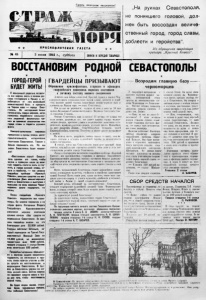 Смерть немецким оккупантам! М О Р Я ★ ★ № 48 К Р А С Н О Ф Л О Т С К А Я Г А З Е Т А 3 июня 1944 г., суббота ПРОЧТИ И ПЕРЕДАЙ ТОВАРИЩУ. ,,На руинах Севастополя, не поникшего головой, дол жен быть воссоздан величе ственный город, город славы, доблести и геройства". Из обращения гвардейцев крейсера „Красный Кавказ В О С С Т А Н О В И М Р О Д Н О Й С Е В А С Т О П О Л Ь ! ГОРОД-ГЕРОЙ БУДЕТ ЖИТЬ! С волнующей радостью встрети ли все моряни весть о полном раз громе гитлеровцев в Крыму и ос вобождении от них важнейшей военко~морской базы и крепости на Черном море — города Сева стополь. Но нестерпимой болью наполнились сердца моряков, когда появились подробности неслыхан ных злодеяний фашистских гро мил во временно захваченном ими городе славы и гордости русского флота. Немецко-румынские мерзавцы превратили в руины улицы, досто примечательности, исторические памятнини Севастополя. Тяжело и больно переживать это. Но мы знаем: Севастополь будет возрож ден! «Восстановим рэднсй Севасто поль сделаем его таким, чтобы внуки и правнуки наши за вели* ную гордость считачи жить и слу жить в городе русской славы, от ваги и геройства, — так заявили гвардейцы крейсера «Красный Кавказ», внесшие средства на вос становление Дома военно-морского флота в Севастополе и выступив с призывом ко всем морякам Черно' морского флота поддержать их почин. Почин гвардейцев «Красного Кавказа» поддержали все черно морцы. Он широко подхвачен и на нашем флоте. Катерники Второго Гвардейского Краснознаменного дивизиона морсних охотников дружно начали сбор средств на возрождение Севастополя. За один день гвардейцы внесли на это благородное дело 2 2 .0 0 0 рублей. Гвардии лейтенант Штаньно, ко торый подписался на Третий Госу дарственный Военный Заем на 1 0 .0 0 0 рублей, на возрождение города-героя внес 1 0 0 0 рублей, гвардии стгршина 1 статьи Беляев внес наличными 6 0 0 рублей. Гвардейцы'наторники обращают ся к морякам нашего соединения поддержать их начинания и при нять самое горячее участие в сбо ре средств ка висстановлениѳ и возрождение Севастополя. В бит вах за Севастополь моряни не жа лели жизней своих. Сейчас моряни не пожалеют средств своих и тру да для того, чтобы восстановить родной город. гвардейцы призывают Обращение краснофлотцев, старшин и офицеров гвардейского дивизиона морских охотников к личному составу нашего соединения Девятого мая бойцы доблестной Краской Армии и моряки Чер номорского флота освободили город боевой славы, доблести и герой ства народов нашей 'страны, важнейшую военно-морскую базу н '.крепость на Черном море. — город Севастополь. Кто из нас не радовался, слушая об этом в ночь на 10 мая приказ Верховного 'Главнокомандующего Маршала Советского Сою за товарища Сталина. Отныне Севастополь наш п навеки! 22 «месяца его -улицы топ тали немцы, разрушали все, что дорого нашему сердцу: велико лепные ідвориы, красивые улицы и незабываемые памятники исто рического прошлого русского народа, русского флота. Ценнейшие из них: .памятник Ленину. Севастопольская нонарама, музей Крымской войны, памятник' Тотлебену и многое другое превращено <в руины. Но нельзя сжечь, разрушить любовь народа к городу, имя ко торого вписано в историю величайшей борьбы за независимость нашего государства. II" теперь, копа над Севастополем гордо реет красный флаг победы, каждый из нас стремится .вложить св