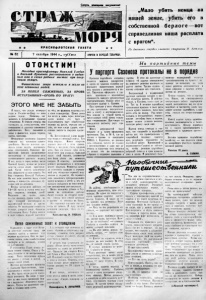 Смерть щемящим оккуваятаігі ★ ★ К Р Д С Н О ф Л О Т С К Д Я ГАЗЕТА ★ ★ >6 82 7 октября 1844 г., суббота ПРОЧТИ К ПЕРЕДАЙ ТОВАРИЩУ. „Мало убить немца на нашей земле, убить его в собственной берло ге—вот справедливая наша расплата U с врагом И з днев ни ка гвардии главного ст а рш и ны И . К о т л п р . О Т О М С Т И М ! Молодые краснофлотцы Николай Глобин и Василий Лукьянов рассказывают о видан­ ном ими в своих родных местах при окку­ пации немцев. Фашистские звери истязали и жгли на огне невинных людей. ЗА ПЕПЕЛ СОЖЖЕНЫХ, ЗА КРОВЬ ИСТЕРЗАНПЫХ—ОГОНЬ ПО ВРАГУ ! Э ТО ГО МНЕ НЕ ЗАБЫТЬ Я в и д и , что делали немецкие гады в Ростбве-наіДону — моем родном городе. Особенно • вы ­ делялись в потреблении граждан гестаповцы. В первую очередь они ■охотились за коммунистами, ком ­ сомольцами и другими советскими работниками. Всех, попавших в лапы к .фашистам, ждала тюрьма, пытка, виселица. ‘Невиданные злодеяния бандиты, учиняли над пленными красно­ армейцами. Многим жителям при­ шлось лично видеть издеватель­ ства гитлеровцев. Однажды фа- ш истек п<> изверг 11 воору же ни ые пистолетами и автоматами вели военнопленного раненого моряка. И вот, когда в город вошли части Красной Армии, немцы не успели замеСти следы своих преступле­ ний. Среди многих замученных был обнаружен и труп моряка. Это был старшина Николаи Горбунов. На его геле заметны были следы •ожогов и множество сквозных п у ­ левых ра'п из автомата. -Немцы заставляли работать по 14— і(> часов в с у т к и всех п и - ряд: стариков, женщин, четен. Выдавали им всего лишь но .рто двадцать грамм хлеба на день, который изготовлялся из картофельной -шелухи и других отбросов. От недоедания возникали Лодезшг, умирали люди. Однажды мой товарищ Павел Торбип вышел ■в ноле собрать мерзлой картошки на ооед, но фашисты схватили его и свою комендатуру. Павел и.пез без вести и лишь через некоторое время нашли его труп в изуродованном вид'1: обрубленные пальцы на руках, отрезан нос и уши, на тело следы ударов, нане­ сенных каким-то твердым предме­ том. На. Боготяновокой улице фаши­ сты творили кровавый разгул. Там была тюрьма. Много замучено мирных жителей в этом здании. Вместе с матерями были грудные дети. Там им мазали губы ядом, после чего они умирали. Однажды около этой тюрьмы, неизвестна кем были убиты два немоіких солдата. В отместку, гестаповцы решили расправиться с жителями целого квартала. Фашисты загна­ ли советских граждан в деревян­ ный дом, облили его горючей жид­ костью и подожгли. Из горящего дома доносились душераздирающие крики женщин и детей, а тех кто пытался выбраться из огня немец­ кие автоматчики расстреливали. Много молодежи у г’пано в Гер­ манию на каторжные работы. Людей сгоняли на сборные п у н к ­ ты, откуда -всех силой загоняли в вагоны и увозили на Запад. Эти страшные картины мне ни­ когда но забыть. Я буду мстить немецким людоедам, бить их Г-.- поща іы. Краснофлотец Н. ГЛОБИН. Пепел сожженных зовет к отощениш Ворвавшись в наше село Олеит ня немецкие варвары сразу же учинили грабеж и насилие над мирным населением. Они не брез­ говали ничем, даже хозяйственные предметы и те отбирали, увозив их в Германию. У колхозника Голик немцы ре­ шили отнять корову. Семья у Го­ лика большая и он воспротивился этому. Тогда гитлеровцы избили его вместе с детьми и женой, а корову силой увели. Жестоко расправились фашисты с. братьям