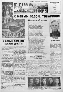 С м е р т ь н е г а с ц н и м он му г*жм га т і С НОВЫЙ ГОДОМ, ТОВАРИЩИ ! К Р А С И О Ф Л О Т С И А Я Г А З Е Т А 1 января 1944- г, суббота № 1 ПРОЧТИ И ПЕРЕДАЙ ТОВАРИЩУ- Новогодний шост К НОВЫМ ПОБЕДАМ, БОЕВЫЕ ДРУЗЬЯ! Наступил новый, 1944 -й год. Этот год, как и минувший, мы встречаем с оружием в руках, бес­ пощадно кстрвбляя немецко-фа­ шистских захватчиков. Мы уверенно смотрим в буду­ щее, верим — наша возьмет! Недалек час полного разгрома ненавистного врага, посягнувше­ го на богатства, на народ нашей Отчизны, нарушившего наш мирный труд и цветущее счастье. Славные сыны советской Родины, закаленные а боях и испытаниях, сумеют полностью истребить подлого врага. Наша вера в свою победу непоколебима, как и наша сила. Прошедший, 1943 -й год, войдет в истерию нашей священной борьбы нам год коренного перелома в хо­ де Отечественной войны. В 1943 году Красная Армия и Военно- Морской Флот осуществили боль­ шое летнее наступление, нанесли немецким войскам могучий удар, перебили и перемололи наиболее опытные старые кадры фашист­ ско-немецких войск, закалив вме- сте с тем и умножив свои собст* венные кадры. Наше наступление развивается. Бои идут за Днеп­ р у , на полях Белоруссйи, близко 0т границ Латвии и Литвы. Не­ мецкая арммр не оправилась от летнего поражения и не может удержать наступательного порыва Красной Армии, которая продол" *ае т освобождать из под немец­ кого ига город за городом, село за ьелом. «Фашистская Германия пере­ вивает глубокий кризис. Она ^тоит перед своей катастрофой». ( ТАЛИН), События будут разви* ватьея т а к , к а н их предопределили на Тегеранской конференции ру* ководители трех держав— Англии, СССР, Америки. © В новый год мы вступаем с возгласом: «Вперед, на Запад!». Удар за ударом наносят по вра­ гу моряки нашего соединения, сражаясь на правом фланге, в су­ ровом Заполярьи. Накануне 1944-го года катера старшего лейтенанта Александра Шабалина и лейтенантов Георгия Паламар- чука и Дмитрия Холодного осуще­ ствили лихую атаку крупного немецкого конвоя и добились по­ беды, весть о которой разнеслась по нашей стране. Наши судоре­ монтники выполнили годовую про­ грамму за 8 месяцев и 20 дней. Но не нам, военным морякам, успокаиваться на достигнутых успехах. Недаром, поздравляя друг друга с новым годом, боевые друзья говорят: «За новые побе­ ды!». Поднимем же, боевые друзья, гост за нашу близкую победу, за наш народ, за наших детей, се­ стер, матерей, с чьим благослов- ленкем мы идем в бой и чья лю­ бовь хранит нас на поле брани! Поднимем тост за нашу великую Родину, во имя которой мы сра­ жаемся, не жалея своей жизни! Поднимем тост за лю,б#мого Сталина, кто своим мудрым руко­ водством умножает каши силы для разгрома ненавистного врага! Пусть непрерывно растут на­ ши удары по врагу! С именем великого Сталина на устах вперед, североморцы —- на. вест! Товарищи! Сегодня ьсем народом Сорок четвертый мы встречаем год. Позвольте всех поздравить с новым годом, Который нам победу принесет. Товарищи! Вы знаете отлично, Что год проходит нынче необычный, Суровый год решительных боев За нашу волю, заводимый кров, За юную, прекрасную Отчизну, За солнца свет, за наше право жить. Нет, никогда проклятому фашизму Страны Советов не поработить! Не знать покоя вражеской породе! Не уцелеть в бушующем огне! И не жиреть на^ нашем огороде Завшивевшей коричневой свинье! Уже в смятеньи злобный 