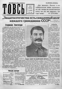 Пролетарии всех стран, соединяйтесь! ТОВСЬ К Р А С Н О Ф Л О Т С К А Я Г А З Е Т А № 57 ПЯТНИЦА 5 декабря 1941 года ПО ПРОЧТЕНИИ УНИЧТОЖИТЬ. „Дух великого Ленина и его победоносное знамя вдохновля ют нас теперь на отечественную войну так же, как двадцать три года назад“ . И. СТАЛИН. „Защита отечества есть священный долг каждого гражданина СССР“. Сталинская Конституция 5 декабря 1936 года Чрез вычайный ѴІІІВсесоюзный съезд Советов принял новую Консти туцию, которая в законодатель ном порядке закрепила завое ванный и осуществленный в СССР социалистический строй и его государственное устройство. В самой демократической в мире Сталинской Конституции записаны всемирно-историче ские победы социализма, дос тигнутые под руководством пар тии Ленина—Сталина. Консти туция закрепила руководящую роль нашей партии в борьбе трудящихся за коммунизм. Пять лет под немеркнущими лучами Сталинской Конститу ции рос и развивался Советский Союз. Трудящиеся нашей мно гонациональной страны пользо вались всеми благами счастли вой, культурной, зажиточной жизни, боролись за новые побе ды на всех участках социали стического строительства. Мирную, творческую жизнь народов СССР нарушил веро ломный и коварный враг—гер манский фашизм. Кровавый па лач Гитлер решил покорить Россию, онемечить весь наш народ, превратить его в рабов. Пять с лишним месяцев идет Великая Отечественная война. Фашистские бандиты на времен но захваченной советской зем ле грабят и жгут наши города и села, мучают и убивают жен щин, детей, стариков. Но это не сломило воли совет ских людей к победе. Товарищ Сталин в докладе 6 ноября го ворил: «Если советский строй так легко выдержал испытания и еще больше укрепил свой тыл, то это значит, что советский строй является теперь наиболее прочным строем». Советские люди еще крепче сплотились вокруг большевист ской партии и товарища Сталина, сплотились для пол ного разгрома и уничтожения всех немецких захватчиков. Ге роические бойцы Красной Ар мии очистили от фашистов Рос- тов-на-Дону, разгромили круп ные отборные танковые и мо топехотные дивизии. Враг бе жит от красных богатырей. Бои идут уже на подступах к Та ганрогу. Южный фронт стал наступательным фронтом. Товарищ Сталин поздравил бойцов и командиров с победой. Это сталинское поздравление вдохновляет всех советских лю дей на новые победы. Враг будет разбит, победа будет за нами, потому что «За щита отечества,—как сказано в Сталинской Конституции,—есть священный долг каждого граж данина СССР». Выполняя его, бойцы Крас ной армии и Красного флота покрыли себя неувядаемой сла вой в боях с фашистскими ор дами. За Родину! За Сталина! За Сталинскую Конституцию! Под руководством любимого Сталина мы разгромим и уни чтожим врага. Товарищи краснофлотцы и командиры! День Сталинской Конституции ознаменуем новым подъемом борьбы за высокее качество и от личные показатели в учебе, ши ре развернем социалистическое соревнование, будем во всеору жии готовыми выполнять свя щенный долг и почетную обя занность каждого гражданина СССР. Письмо матери Где ты, мать моя, где ты, родная ? Не погибла ль от рук палачей Р Ну, а если жива ты: я знаю— Не смыкаешь ночами очей! Много войн ты видала, старушка, Но жестокой такой—никогда. Звери в грохоте танков и пушек Разоряют отчизну труда. Дым орудий застлал наши эори. Немцы жителе
