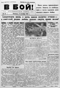 После прочтения—уничтожить Пролетарии всех стран, соединяйтесь! Б О Й ! ★ ★ К Р А С Н О Ф Л О Т С К А Я Г А З Е Т А ★ ★ № 34 Пятница, 3 октября 1941 г. Наша жизнь принадлежит родине. Защита ее свободы, прав и чести— кровное дело каждого нашего бойца. Североморец жизнь и кровь навеки посвятил отчизне — к советской родине любовь сильнее смерти, краше жизни! * * * + * Любовь к родине сильнее смерти Родина! Как много говорит сердцу советского человека это великое слово! Безгранична любовь нашего на рода к своей социалистической отчизне. Мы любим ее за то, что она обеспечила всем нам свобод ный труд и радостную жизнь. И каждый из нас знает, что наша свобода не пришла сама собой, она завоевана в боях с внутрен ними и внешними врагами. Злейший враг всего человече ства — германский фашизм по ставил своей целью поработить наш свободный народ. Он хочет посадить на шею рабочих и кре стьян немецких баронов и ннязей. Не бывать этому! — сказал со ветский народ и весь поднялся на великую отечественную войну. За родину, за свободу и сча стье народное сражается молодое поколение Октября. Продолжая славные боевые традиции своих отцоЬ и братьев, беззаветно пре данные делу партии Ленина — Сталина, советские патриоты ежедневно и ежечасно совершают героические подвиги, нанося врагу сокрушительные удары. Любовь к родине сильнее смерти! Об этом говорят славные боев-ые дева советских воинов на суше, на море и в воздухе. Боец морского отряда комсомо лец Сивков попал в окружение группы фашистов. Винтовкой и гранатами он уничтожил до двух Десятков бандитов. Немцы пред лагали североморцу Сивкову сдаться в плен, обещали сохра нить жизнь. На это мужествен ный боец ответил: «Советские воины в плен не сдаются!» С этими словами последней гранатой он взорвал себя и наседавшую на него группу фашистских сол дат. В разгар сражения командир приказал связному Еремееву до ставить ценный пакет в штаб. На вражеской территории т. Ере меев заметил замаскировавшегося немецкого автоматчика. Ползком подкравшись к «кукушке», он меткой пулей уничтожил фаши ста. Отважного связиста начали обстреливать. Укрывшись за ка мень, Еремеев открыл огонь. Двоих он застрелил, третьего взо рвал гранатой. Приказ командира был выполнен в срок, донесение доставлено. В бою на море был тяжело ра нен краснофлотец нашего соедине ния тов. Егоров. Превозмогая сильную боль, истекая кровью, он продолжал отражать воздуш ную атаку до тех пор, пока не потерял сознание. Сейчас тов. Егоров опять на своем боевом посту, у своего грозного оружия. Таких самоотверженных подви гов можно привести очень много. На одном из наших кораблей во время боя была повреждена ан тенна. Радист Колосов, несмотря на рвущиеся вокруг бомбы и об стрел из пулеметов, взобрался на фок-мачту и исправил антенну. Связь была восстановлена. Так выполняют свой священ ный долг перед родиной советские воины, знающие за что они бо рются, что защищают. Их стой кость и мужество— беспримерны. Горячо любящие родину, бес предельно преданные своему на роду наши бойцы, командиры и политработники, сильные духом, презирая смерть, совершают неза бываемые подвиги во славу своей великой родины. И каждый их новый подвиг приближает неиз бежную гибель врага. -О- Залпы по врагу обогнал группу кораблей 11 в°шел в залив «3». К берегам, где предполагался противник, об ращен внима