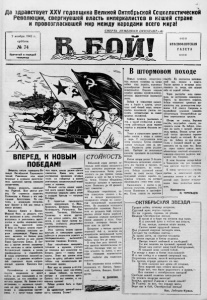 Да здравствует XXV годовщина Велккой Октябрьской Ссцкглкстической Революции, свергнувшей власть империалистов в кгшей стране и провозгласившей мир между народами всего кира! СМЕРТЬ НЕМЕЦКИМ ОККУПАНТАМ! 7 ноября 1942 г. суббота № 74 Прочитай и передай товарищу □ □ □ КРАСНОФЛОТСКАЯ Г А З Е Т А □ □ □ ВПЕРЕД, К НОВЫМ ПОБЕДАМ! Двадцать (пятую годовщину Ве ликой Октябрьской Социалисти ческой Революции наш народ встречает в условиях ожесточен ных сражений против немецких захватчиков. Велика опасность, нависшая над Родимой. Враг рвется впе- ргд. Он стремится захватить Сталинград и Кавказ с его неф тяными богатствами. Не счи таясь с огромными потерями, враг бросает в бой все новые и новые резервы. J Красная Армия и Военно- Морской Флот, за двадцать пять лет выросшие в силу, способную разгромить и уничтожить врага, стойко и храбро защищают каж дую пядь советской земли. 8 боях за Родину немало герои ческих примерив показали мо ряки сэвероморцы. Родина вы соко оценила их боевые дела, присвоив многим из них звание Героя Соватского Союза. В бит вах с врагом многие северомор ские экипажи и части проявили беспримерный героизм, и теперь преобразованы в гвардейские. В числе отмеченных высокой на градой — и дивизион истребите лей подводных лодок, награж денный орденом Красного Зна мени. I I I Краснофлотцы и командиры нашэго соединения за время войны не раз показывали и по казывают, на что способны со ветские моряки. На боевом счету соединения — несколько пущен ных но дну транспортов с вой сками и вооружением против ника, т j п о то тн н ы е подвод ные лодки, свыше десяти сбитых самолетов. Кроме того, много разгромлено вражеоких огневых точек на побережье и немало уничтожено неприятельской живой силы и техники. Личный состав наших кораб лей свято хранит боевые и рево люционные традиции своих отцов и старших братьев — матросов Октября. С гордостью произносятся имена орденоносцев т т . Моль, Лозовского, Демидова, Векшина, Ноханоаского, Рогулькина, Пав- люкова, Ткаченко, Шабалина, Трявогова и многих других. У них учатся воевать, ими гор дятся, с них берут пример му жества, стойкости, дисциплины и организованности. Этих успехов нашим красно флотцам и командирам удалось добиться в результате строгого и последовательного выполнения приказов товарища Сталина. Еще настойчивее овладевать техникой и оружием, учиться не покладая рук искусству- по беждать врага — такова наша задача. Этим мы усилим наши удары по врагу, Собьемся полной победы над ненавистными фа шистскими ордами. Враг еще не сломлен )и не уни чтожен. Родина зовет нас вперед, к новым победам, на лолный разгром и уничтожение врага. Сделать это мы сможем, и на верняка сделаем! 1 Победа должна быть и будет за нами! Да здравствует великий полко в о го товарищ Сталин! СТОЙКОСТЬ Небольшой отряд катеров не сколько дпейі «подряд находился и [море, выполняя различные зада- Iиия 'командсжатия. Затем, разде лявшись на две группы, катера пришли в одну из баз и 'встали на 'бочки. Стоянку обнаружила, вражеокая авиация и произвела налет. Появилось до 40 фашист ских 'самолетов. / Обнаружив стервятников, ка тера немедленно снялись с бо чек и начали маневрировать, одновременно открыв по самоле там интенсивный пулеметный о-гонь. Но положение оставалось чрезвычайно серьезным. Вода ки пела от разрывов бомб, ікоторые рвались вблизи (