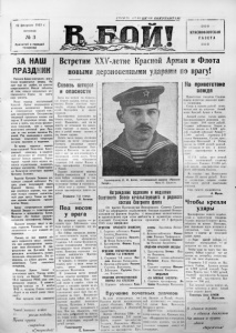 С v r p Th f ' ' Л Ч Ц К И М О К КУПА Н ТА М! 12 ф е в р а л я 1943 і п я т и и ц а № 3 Прочитан и передай товарищу □ □ □ К Р А С Н О Ф Л О ТС К А Я Г А З Е Т А □ □ □ ЗА НАШ ПРАЗДНИК Встретим XXf -летме Красном Аріми и Флота новыми дерзновенными ударами во врагу Красная Армия наступает, она с беями продвигается вперед. Но ераг еще не разбит, он яростно сопротивляется, Нельзя забывать сб этом, нельзя предаваться ус покоенности. Удары по врагу надо усилить. Наша помощь наступающей Красной Армии заключается в успешном выполнении боевых и повседневных заданий каж дым краснофлотцем. Большинство товарищей правильно пеняло зти задачи, В штормезуга погоду, под носом у врага, под огнем фашист ских хищников, они с честью выполняют почетный долг. Луч шие из них высоно оценены Ро диной. Ряд командиров и красно, ф/штцев соединения награжден на-днях орденами и медалями. По праву гордятся моряки главстзршиной Хкльченко. Бесст рашный командир, в трудней шей обстановке он отлично вы полняет боевые задания. Харак терной чертой этого моряка яв. ляется изумительная выдержка, высокое мастерство. Главстарши на Хильченко награжден орденом Красного Знамени. Орденом Красного Знамени на. гражден старший лейтенант Ро- щии, ранее получивший орден Красной Звезды. Он коман дир отважных моряков, чьи дер зкие походы наносят значитель ный урон ерагу. Таким же бое вым орденом награжден красно флотец Фомин. Среди награжденных орденом Красной Звезды — главстаршина Малыгин и краснофлотец Батов. Медалью «За боевые заслуги» награжден краснофлотец Лебедев. Высокие награды зовут к но вым подвигам. Равнение на от личившихся — долг наждого се вероморца. Однако, не все моряки на шего соединения могут сказать, что спи самоотверженно выпол няют свои обязанности. В под разделении тов. Дьячнсва была допущена неисправность вспомо гательного оборудования. Это от разилось на работе другого под разделения. Такое положение нетерпимо. Красная Армия теснит и уничтожает врага. Усилим удары по врагу на Севере! Принесем 25-й годовщине РККА свои севе роморские подарки. В знамена тельном приказе от 7 ноября 1942 г. товарищ Сталин сказал: «Будет и на нашей улице празд ник!» Этот праздник надо завоевать! Сквозь шторм и опасности Копа мы вышли на выполне ние боевого задания, погода, ухуд шилась. Волны хлестали через палубу, обдавая бойцов ледяной водой. Надстройки и снасти скрипели. Краснофлотцы находились на боевых постах, бдительно несли вахту. Промокшие, они ни на минуту не оставляли без наблю дения горизонт и воздух, гото вясь в любой момент пустить в ход боевое оружие. Десять часов подряд, бессменно простоял на посту сигнальщик Соловьев, показывая пример остальным. Краснофлотцев Баш кирова, и Павленко не раз сби вало с ног, но они поднимались и продолжали нести вахту. Четко выполняли свои обязанности старшины 1-й статьи Маноха и Баев, краснофлотцы Степаненко и Радаев. Задание выполнено отлично. Корабль возвратился. И только здесь бойцы веномниди о том, что необходимо сменить насквозь промокшую одежду и отдохнуть. Любят море и суровые боевые походы краснофлотцы паінего ко рабля. Старшина 1-й статьи И. Антонов. Краснііфлотец И. И. Багов, награжденный орденом «Красная івезда». Фото Р. Диамепт. Чтоб'наших войск росла победы , Врага круши снарядом и"торпсдой! Под носом у врага Мы получили задание — до ставить груз. Дейс