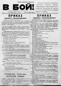 С м е р т ь н е м е ц к и м о к к у п а н т а ® ! К р а с н о ф л о т с к а я г а з е т а № 2 2 с е н т я б р я 1943 г ., ч е тв е р г ПРОЧТИ И ПЕРЕДАЙ ТОВАРИЩУ Усил вн-ием боев ой по дг отов ки , отлич нои во ин ою а выучко и отсалютуем Харьковским, Ель - пенским, Глуховским , Рылье ким и Сексним доблестным войскам Ера сн ои А рм ии , ПРИКАЗ Верховного Главнокомандующего Г ен е рал у а рмии Соколовском у Войска Западного фронта на-днях прорвали сильно укрепленную полосу обороны противника и, развивая наступление на Смоленском направлении, вчера, 30 августа, овладели оперативно важным крупным узлом дорог и важнейшим опорным пунктом обороны Смоленского на правления — городом ЕЛЬНЯ. В боях под городом ЕЛЬНЯ отличились гвардейцы-танкисты генерал-майора БУРДЕЙНОГО, войска генерал-лейтенанта ГОРДОВА, генерал-майора КРЫЛОВА, генерал-лейтенанта ТРУБНИКОВА, летчики маршала авиации ГОЛОВАНОВА и генерал-лейтенанта авиации ГРОМОВА. В ознаменование победы, одержанной нашими войсками под горо дом ЕЛЬНЯ, 29 Гвардейской Краснознаменной стрелковой дивизии, 76 стрелковой дивизии, 25 Танковой бригаде, 26 Танковой бригаде, 23 Гвар дейской отдельной танковой бригаде и 119 отдельному танковому полку, отличившимся в боях под городом ЕЛЬНЯ, присвоить наименование «ЕЛЬНЕНСКИХ» и впредь их именовать: 29 Гвардейская Краснознаменная Ельненская стрелковая дивизия; 76 Ельненская стрелковая дивизия; 25 Ельненская танковая бригада; < 26 Ельненская танковая бригада; 23 Гвардейская Ельненская отдельная танковая бригада; 119 Елыгенский отдельный танковый полк. От имени Родины наша столица МОСКВА сегодня, 31 августа, в 19 часов будет салютовать нашим доблестным войскам, одержавшим победу под городом ЕЛЬНЯ, — двенадцатью артиллерийскими залпами из ста двадцати четырех орудий. За отличные боевые действия и умение маневрировать о б ’являю благодарность всем руководимым Вами войскам, участвующим в опера циях на Смоленском направлении. Особенно отмечаю умелые действия: 29-и Гвардейской Краснознаменной Ельненской стрелковой дивизии генерал-майора СТУЧЕНКО, 76 Ельненской стрелковой дивизии полковника БАБАЯН, 2о Ельненской танковой бригады полковника ШЕВЧЕНКО, 26 Ельненской танковой бригады полковника НЕСТЕРОВА, 23 Гвардейской Ельненской отдельной танковой бригады полковни ка КАЛИНИНА, 119 Ельяенского отдельного танкового полка подполковника ЛОСИКА, 63 стрелковой дивизии полковника ЛАСКИ НА. Вечная слава героям, павшим в борьбе за свободу и честь нашей Родины. Смерть немецким захватчикам. ' і Верхавный Главнокомандующий Маршал Советского Союза И . ( ТАЛИН. 31 августа 1943 года. СЛАВНЫЕ ПОБЕДЫ КРАСНОЙ АРМИИ Бойцы и командиры) собрались у решродуеторо». Диктор читал приказ Верховното 1'лавнокомандующего Мар шала. 'Советского Союза, товарища. Сталина. Огромной радостью ішіолни- дшеь сердца командиров и краснофлот цев. Взят Таганрог! - Победа Красной Армии, — сказал {'ріи^Н^фЛОТЛЦ. <пт манию и приближает окончательный час победы над иен. Приказ товарища Сталина встречен ■с величайшим) энтузиазмом всеми бой цами и командирами, он вызвал новый боевой лод’ем. и Личным состав нашего соединения сейчас проникнут одним стремлением: подготовить себя к предстоящим боям Л і н і і І і М й І і П Р И К А З Верховного Главнокомандующего наступлением вступили в Се- РЫЛЬСК от Генералу армия Рокоссовскому Войска Центральною 