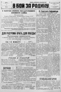 1943 г, И 10 н ь г* о С У Б Б 0 Т А Na 46 Смерть ненецким оккупан там ! Краснофлотская г а з ет а ПРОЧТИ II ПЕРЕДАЙ ТОВАРИЩУ О ВЫПУСКЕ ВТОРОГО ГОСУДАРСТВЕННОГО ВОЕННОГО ЗАЙМА Постановление Совета Народных Комиссаров Союза СС Р 2. Облигации Займа и доходы от них, в том числе выигрыши, ос вободить от обложения государст венными и местными налогами и сборами. 3. Утвердить представленные Народным Комиссариатом Финан сов Союза ССР условия выпуска Второго Государственного Военно го Займа. Председатель Совета Народных Комиссаров Союза ССР И. С ТАЛИН . Управляющий Делами Совнаркома СССР Я. Ч А ДАЕВ . Москва, Кремль. 4 июня 1943 г. ДЛЯ РАЗГРОМА ВРАГА, ДЛЯ ПОБЕДЫ! Постановление правительства выпуске Военного Займа нашло горячую поддержку у всех краснофлотцев и командиров * * * В целях привлечения дополни тельных средств на оборону страны Совет Народных Комиссаров Союза ССР п о с т а н о в л я е т : 1. Выпустить Второй Государ ственный Военный Заем на сумму 12 миллиардов рублей, сроком на 20 лет. 0 ЗА 1 5 МИ Н У Т П е р в ы м н а м и т и н г е в з я л сл о в о с е к р е т а р ь п а р т о р г а н и з а ц и и с е р ж а н т О си п о в . Он п р и з в а л в е с ь л и ч н ы й с о с т а в к д р у ж н о й п о д п и с ке н а заем . — Я п о д п и с ы в аю с ь н а п о л т о р ы т ы с я ч и р у б л е й ,— з а к о н ч и л он свое в ы с т у п л е н и е . П р и м е р у т. О с и п о в а п о с л е д о в а л и д р у г и е . К р а с н о ф л о т е ц Е р о ф е е в п о д п и с а л с я н а с у м м у , р а в н ую 5 - т и м е с я ч н о м у д е н е ж н о м у с о д е р ж а н ию . К р а с н о ф л о т ц ы К у л и к о в , В а л е е в и А в р а м е н к о п о д п и с а л и с ь п а т р е х н д в у х м е с я ч н ы е о к л а д ы . З а 15 м и н у т в се п о д п и с а л и с ь н а В т о р о й В о е н н ы й З аем . — Р а з г р о м и м п р о к л я т ы х в р а г о в ч е л о в е ч е с т в а — г е р м а н с к и х ф а ш и с т о в и и х п р и х в о с т н е й , у с и л и м н аш и у д а р ы но в р а г у I — под т а ким л о з у н г о м п р о ш л а у н а с п о д п и с к а н а заем. К р а с н о ф л о т е ц П. А н т о н о в . 297 G б о л ьш и м п о д ъ е м ом п р о ш е л у н а с м и т и н г , п о с в я щ е н ны й займ у. К р а с н о ф л о т е ц Я с т р е б о в с к а з а л в с в о е м в ы с т у п л е н и и : „ Ф р и ц ы и г а н с ы н а ф р о н т е у ж о с к у л я т и воют, а н а ш в о е н н ы й з а е м и х в з е м лю з а р о е т ”. К р а с н о ф л о т е ц Ф у р у к и н п о д п и с а л с я н а ООО п р о ц е н т о в о к л а д а , Л о с е в — 800 п р о ц е н т о в , С о р о ч е н к о— 400 п р о ц е н т о в , а п о д р а з д е л е н и е в ц ел ом — на 297 п р о ц е н т о в к м е с я ч н о м у ф о н д у з а р п л а т ы , п р и ч е м 55 п р о ц е н т о в с у м м ы п о д п и с к и в н е с е н о н а л и ч н ы м и . М л а дш и й л е й т е н а н т И. Рябуха. РУБЛЕМ И ГРАНАТОЙ В р а г не доби т. З е л е н ы е ф р е н ч и П о к а ещ е х о д я т по р у с с к о й зем л е . Н а с ж д у т и в О д е с с е , во Л ь в о в е ,и в К е р ч и И с г о р д о с т ью см о т р я т н а н а с в К р е м л е . М ы — д о л ж н и к и . Р а с с ч и т а е м с я с гадом З а к а ж д ы й р а з б и т ы й к и р п и ч и к с п о л н а . Р у б л е м и гр а н а т о й , ш ты к о м и п р и к л ад ом З а д у ш и м , добьем , у н и ч т о ж и м в р а г а ! Чтоб в би тве п о сл ед н ей у ч а с т в о в а т ь л и ч н о , Ч т о б р ад о с ть победы д е л и т ь п о п о л а м ,— Я с р ад о с тью , с го р д о с т ью и н а л и ч н ы м и Г о с у д а р с т в у в заем с б е р е ж е н ь я отдам ! _________ К р а с н о ф л о т е ц К. Андреев. ПРИБЛИЗИМ ДЕНЬ ПОБЕДЫ М л а д ш и й с е р ж а н т т. П о л я к с к а з а л , в ы с т у п а я н а м и т и н г е : — Я п о д п и с ы в аю с ь н а 800 р у б л е й . П у с т ь мои Р у б л и п о м о г у т д е л у р а з г р 