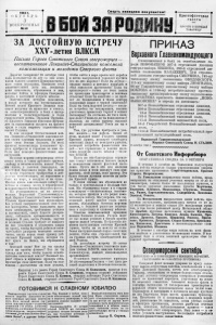 3 В О С К Р Е С ІШ Ь 1.\ № ш 1943 Г. (і к т Я Б р Ь Смерть немецним оккупантам! ОЯЗПРО Краснофлотская г а з е т а ПРОЧТИ И ПЕРЕДАЙ ТОВАРИЩУ ЗА ДОСТОЙНУЮ в с т р е ч у ХХѴ-летия ВЛКСМ Письмо Ггроге Советского Союза североморцев — воспитанников Ленинско-Сталинского комсомола комсомольцам и молодежи Северного флота Дорогие товарищи! 29 октября 1943 года исполняется 25 лет со дня осно вания нашего славного Коммунистичес кого союза молодежи. Накануне этой знаменательной даты мы, воспитан ники комсомола, обращаемся к вам, молодые бойцы и офицеры Северного флота, о достойной встрече юбилея. Замечательна история комсомола, в рядах которого мы воспитывались. Боевой орден Красного Знамени ком сомол получил за мужество и отвагу, за самоотверженность в боях с интер вентами и белогвардейцами в годы гражданской войны. Орденом Трудово го Красного Знамени комсомол награж ден за выдающиеся заслуги на фронте труда в годы мирного строительства нашей Родины. В дни великой Отечественной вой ны Лепинско-Сталинский комсомол ве рен своим славным традициям и умно жает свои боевые подвиги. ІТа всех фронтах комсомольцы показывают чу деса храбрости и героизма во имя по беды над немецко-фашистскими зах ватчиками. Молодые моряки-североморцы отста ивают честь и славу русского оружия, свободу и независимость нашеіі Роди ны здесь, в далеком Заполярья, на просторах Баренцева моря. Мы мелеем ію праву гордиться храбростью и доб ле с т ью комсомольцев, их героизмом в боях на морс, в воздухе и на суше. Многие имена комсомольцев займут по че тно е и славное место в героической истории нашего Военно-Морского флота. По успокаиваться ни на минуту нельзя. Верховный Главиокомандую- щнй Маршал Советского Союза товарищ Сталин приказывает нам продолжать без устали совершенствовать свое бое вое мастерство, точно выполнять при казы командиров, требования уставов и наставлений, свято блюсти дисцип лину, соблюдать организованность и порядок. В дни, когда Родина, партия и великий Сталин требуют от каждого из нас усиливать и усиливать удары по врагу, чтобы быстрей добиться окон чательного разгрома немецких захват чиков, когда перед нами пример доб лестной Красной Армии, которая го нит врага на Запад, мы обращаемся к вам: Молодой воин! Все ли ты сделал здесь на правом фланге? Все ли ты сделал для того, чтобы помочь освобо дителям советской земли? Военный мо ряк! строго и вдумчиво проверь себя, просмотри свои действия. Если ты под водник — достаточны ли твои усилия, чтобы найти в морс вражеский корабль и метко выпущенной торпедой пустить его на дно морское? Если ты летчик— сколько нашел и потопил кораблей и сбил самолетов противника? Если ты артиллерист — точны ли твои залпы по вражеским транспортам и военным объектам? Если ты зенитчик — не прой дет ли безнаказанно в твоем секторе воздушный пират с черной свастикой? Если ты боец морской пехоты — сколь ко истребил ты гитлеровцев, сколько уничтожил вражеских берлог в сопках Заполярья? Не отстаешь ли ты в воен ном деле? Учишься ли ты каждодневно? Являешь ли собой пример высокой воинской дисциплины? Готов ли ты в бой? Там, где р у с с к а я храбрость и уме ние воевать — там победа. ІІомш і об этом, молодой воин! У сили ть помощь Красной Армии , поскорей освободить советских людей от немецкого рабства, поскорей истребить ф аш и с т ски х зве рей — вот ст