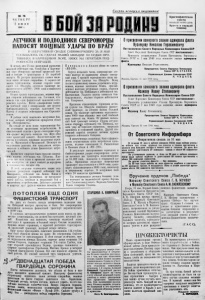 D Смерть немецким оккупантам! № 7 6 Ч К Т В L 1» I' 1 И Н) н я 1944 г. Q □ ІБІІЗІРІІ Краснофлотская газета ВЫХОДИТ Ч Е Р Е З ДЕНЬ П р о ч т и и п е р е д а й товарищу ЛЕТЧИКИ И ПОДВОДНИКИ СЕВЕРОМОРЦЫ НАНОСЯТ МОЩНЫЕ УДАРЫ ПО ВРАГУ И ОПКРЛТИВНОЙ СВОДКЕ СОВИНФОРМБЮРО ЗА 26 МАЯ ; СООБЩАЛОСЬ ОЬ УДАРАХ НАШЕЙ АВИАЦИИ ПО СУДАМ ПРО- ! ТИВІ !ИК‘Л В ЬАРННЦОВОМ МОРЕ. НИЖЕ МЫ ПЕЧАТАЕМ ПОД- 1 РОВНОСТИ ОПЕРАЦИИ. — ------------------- -- ------------------ ---------------- К исходу дня 25 мая воздушный разведчик младший лейтенант тов. Сологубов в Баренце вом морс обнаружил крупный вражеский коп ной в составе о транспортов и 25 кораблей эскорта. На разгром вражеского конвоя выле тели наши летчики - гвардейцы. G первого же захода торпедоносцы, ведомые гвардии капи таном юн. ІІІкаруиа, потопили транспорт во доизмещением в (»000 -- 7000 тонн и миноносец противника. Нторап группа торпедоносцев, ведомая гвар дии старшим лейтенантом тов. Гпетовым, ата ковала еще один фашистский миноносец и сто рожевой корабль. Почти одновременно нанес ли бомбовой удар с пикирования две группы бомбардировщиков, ведомых капитаном тов. Плотко и старшим лейтенантом тов. Стрельни ковым. 15 районе цели завязались воздушные бон, r ходе которых истребители прикрытия сбили три «Мессершмитта». На отходе от цели наши торпедоносцы бы ли атакованы вражескими истребителями. В ожесточенной схватке стремя «мессерами» стре лок-радие г ведущего экипажа тов. Жук сбил один вражеский самолет. Исключительное му жество и стойкость проявили воздушные стрел ки тт. Матневскпй и Фроловскнй. Несмотря на полученные ранения, они продолжали отстре ливаться и отбивать атаки фашистских истре бителей. Вражеским снарядом была серьезно повреж дена машина лейтенанта тов. Губанова. Нап рягая все спои силы и проявляя высокое лет ное мастерство, он довел самолет до аэродрома и благополучно посадил его. И ;»гой операции отличились также воз душные разведчики старший лейтенант тов. Ианкрашнн. лейтенант тов. Авцпн. Попав в сложные условия, разведчики, не прекращая своей работы, вступили в воздушный бой с вражескими истребителями. Действуя слаженно и выручая друг друга в опасные моменты, тт. П а н к р а ш и и и Ав ци н сбили по одному «МЕ-109». Спустя несколько часов, североморские лет чики нанесли по вражескому конвою повтор ный удар. С группой торпедоносцев снова вы летел гвардии капитан тов. ІНкаруба. Вслед за ним к вражескому конвою устремились штур мовики, ведомые капитаном Осыка, прослав ленным мастером штурмовых ударов, старшим лейтенантом тов. ІПейкиным и лейтенантом тов. Калмыковым. Ударную группу замыкали бом бардировщики, ведомые старшим лейтенантом тов. Сахаровым. Крупными сброшенными торпедами летчи ки группы тов. Шкаруба повредили фашист ский транспорт, на котором возник большой пожар. ІІа транспорт противника водоизмеще нием 8000 тонн обрушил весь свой бомбовой груз капитан тов. Осыка. От прямых попада ний бомб транспорт затонул. Группа штурмо виков старшую лейтенанта тов. НІейкина, на неся удар по кораблям охранения, повредила миноносец и сторожевой корабль. Другой сто рожевой корабль потопили летчики группы старшего лейтенанта Сахарова. В ожесточенных воздушных боях с фашист скими стервятниками наши истребители прик рытия, ведомые капитанами тт. Рассадкиным и Коневым сбили 4 «МЕ-109». В результате массированных торпедных и бомбоштурмовых ударов