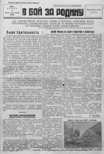 Пос ле п р о ч т е н и я у н и ч т о ж и т ь 1941 г. Н О Я Б Р Ь 3 ПОНЕДЕЛЬНИК №>26 ПРОЛЕТАРИИ ВСЕХ СТРАН, СОЕДИНЯЙТЕСЬ! 1 i n зяшиш Краснофлотская г а з е т а І І Ш Е ^ К В Н „ДА ЗДРАВСТВУЮТ КРАСНАЯ АРМИЯ И ВОЕННО-МОРСКОЙ ФЛОТ, ГЕРОИЧЕСКИ ЗАЩИЩАЮЩИЕ СВОБОДУ И ЖИЗНЬ НАРОДОВ СССР ОТ НЕМЕЦКО-ФАШИСТСКИХ ЗАХВАТЧИКОВ!" (Из лозунгов ЦК ВКП(б) к 24-й годовщине Великой Октябрьской социалистической революции) Выше бдительность Грозные дни переживает наша родина. За каж дый метр советской земли идут ожесточенные бои. Напрягая все свои силы, гитлеровские пол чища рвутся к жизненным центрам нашей стра ны. Чтобы остановить продвижение врага, а за тем его окончательно уничтожить, каждый из нас должен отрешиться от настроения благоду шия, беспечности и крепить революционный по рядок и железную воинскую дисциплину. „Преж де всего необходимо,—говорит товарищ Сталин,— чтобы наши люди, советские люди поняли всю глубину опасности, которая угрожает нашей стране, и отрешились от благодушия, от беспеч ности, от настроений мирного строительства, вполне понятных в довоенное время, но пагуб ных в настоящее время, когда война коренным образом изменила положение". Осознать всю глубину опасности вовсе не значит впадать в панику, в уныние и малоду шие. Наоборот. На каждом боевом посту — на корабле и в части, в охране военного объек та, в разведке и в дозоре, в бою и на отдыхе — всюду и везде надо быть бдительным и зорким. ^Именно так и поступает личный состав корабля тов. Косминюка. Как и в прежних боях, в бою 1 - го ноября с фашистскими стервятниками крас нофлотцы этого корабля первые обнаружили хит рого и коварного врага. Их бдительность обес печила успех боя. Оставив два самолета на дне морском, враг бежал. Малейшее ротозейство и беспечность должны беспощадно уничтожаться в наших рядах. Рото зей — пособник врага. Болтуны и пустомели — играют на руку врагу. Враг их ищет и любит, а мы должны их выжигать каленым железом. Заблуждающемуся надо настойчиво разъяснять вред паники, болтливости, ротозейства. Провока тора и шпиона надо немедленно брать за шиво рот. Всегда и везде помни, что высокая органи зованность и бдительность — грозное оружие советского народа в борьбе с проклятым фашиз мом. БОЕВОЙ КОРАБЛЬ НА ЗАЩИТЕ ПОДСТУПОВ К ЛЕНИНГРАДУ ПОСТРОИМ АВИАЭСКАДРИЛЫ0 „ С О В Е Т С К О Е З А П О Л Я Р Ь Е " Комсомольцы корабля го- эскадрильи. .Пусть наши рячо подхватили иницпа- летчики получат все боль- тиву комсомольцев Мур- ше и больше краснозвезд манска и Северного флота ных ястребков. по сбору средств на пост ройку авиаэскадрильи „Со ветское Заполярье“. Комсомолец Пашков, вно ся на постройку авиаэскад рильи 350 рублей, сказал: — Все свои сбережения отдаю на постройку авиа- Комсомольцы Тихонов, Поляков и Шейн внесли в фонд постройки авиаэскад рильи наличными по 300 рублей, Огиенко, Васю- хии — по 200 рублей, Мирошниченко — 160 руб лей. С. Г. ПАНОВ ☆ ☆ ☆ С большим подъемом про- рублей, старшина2-й статьи т. Кувалдин — 150 рублей, ходит сбор средств на пост ройку авиаэскадрильи „Со ветское Заполярье". Бой цы и командиры катера т. Миготина внесли в фонд постройки 2100 рублей. Боец т. Смирнов внес 100 старшина 1-статьи т. Дол- жеиков — но рублей. Сбор средств продол жается с неослабевающим подъемом. СОБЯНИН. В свое время Маршал Со ветского Союза Климент Ефремович Ворошилов час то бывал на этом корабле. Он ходил в