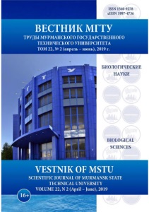 ISSN 1560-9278 elSSN 1997-4736 ВЕСТНИК МГТУ ТРУДЫ МУРМАНСКОГО ГОСУДАРСТВЕННОГО ТЕХНИЧЕСКОГО УНИВЕРСИТЕТА ТОМ 22, № 2 (апрель - июнь), 2019 г. БИОЛОГИЧЕСКИЕ НАУКИ BIOLOGICAL SCIENCES