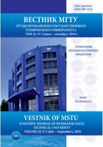 ISSN 1560-9278 elSSN 1997-4736 ВЕСТНИК МГТУ ТРУДЫ МУРМАНСКОГО ГОСУДАРСТВЕННОГО ТЕХНИЧЕСКОГО УНИВЕРСИТЕТА ТОМ 22, № 3 (июль - сентябрь), 2019 г. ТЕХНОЛОГИЯ ПРОДОВОЛЬСТВЕННЫХ ПРОДУКТОВ Ь— -i— — FOOD TECHNOLOGY VESTNIK OF MSTU SCIENTIFIC JOURNAL OF MURMANSK STATE TECHNICAL UNIVERSITY VOLUME 22, N 3 (July - September), 2019