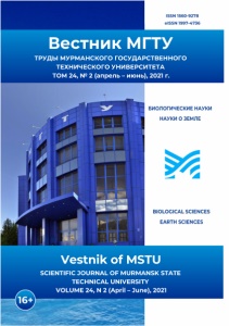 ISSN 1560-9278 elSSN 1997-4736 Вестник МГТУ ТРУДЫ МУРМАНСКОГО ГОСУДАРСТВЕННОГО ТЕХНИЧЕСКОГО УНИВЕРСИТЕТА ТОМ 24, № 2 (апрель - июнь), 2021 г. БИОЛОГИЧЕСКИЕ НАУКИ НАУКИ О ЗЕМЛЕ