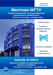 ISSN 1560-9278 elSSN 1997-4736 Вестник МГТУ ТРУДЫ МУРМАНСКОГО ГОСУДАРСТВЕННОГО ТЕХНИЧЕСКОГО УНИВЕРСИТЕТА ТОМ 24, № 4 (октябрь - декабрь), 2021 г. ЭЛЕКТРОТЕХНИКА ТЕХНОЛОГИЯ ПРОДОВОЛЬСТВЕННЫХ ПРОДУКТОВ ELEC TR ICAL ENGINEERING Vestnik of MSTU TECHNOLOGY o f FOOD PRODUCTS SCIENTIFIC JOURNAL OF MURMANSK STATE TECHNICAL UNIVERSITY VOLUME 24, N 4 (October - December), 2021